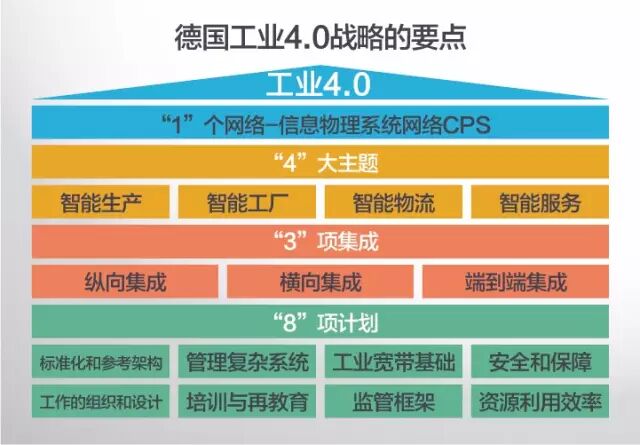 德国政府所定义的德国工业4.0,由一个信息,一个网络,四大主题、三项集成、八项计划组成的框架机构。德国政府提出工业4.0整体框架有很多地方和中国的实际国情不同,操作上面还有一定的距离。