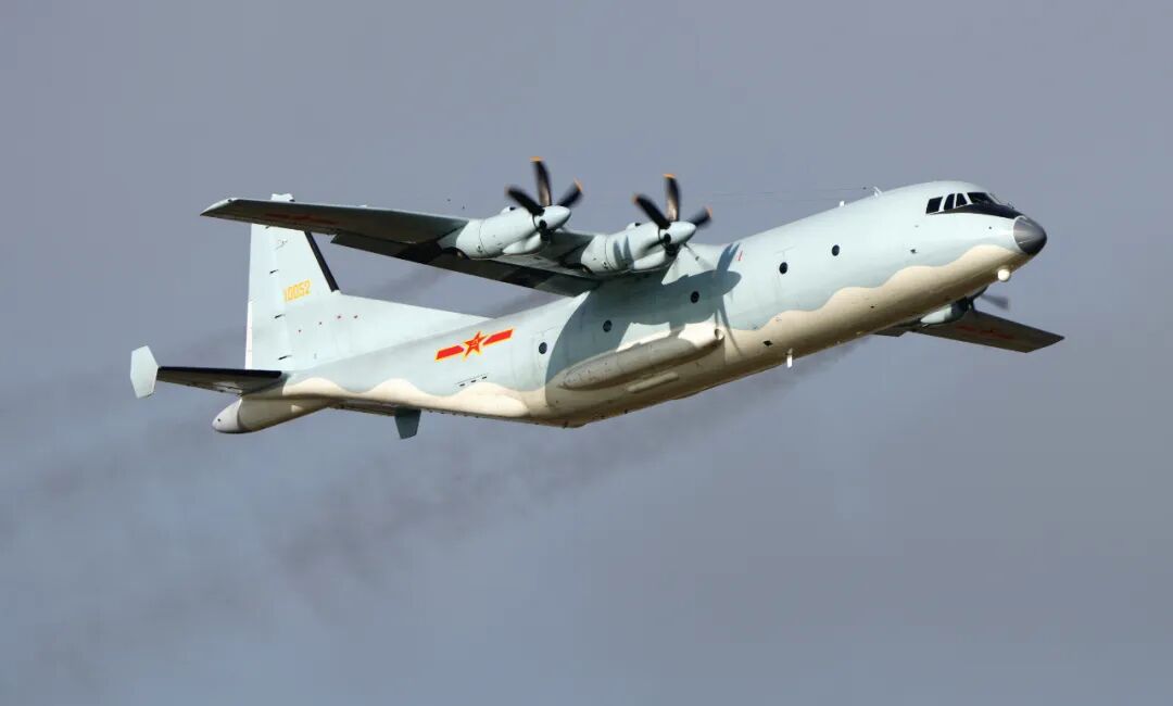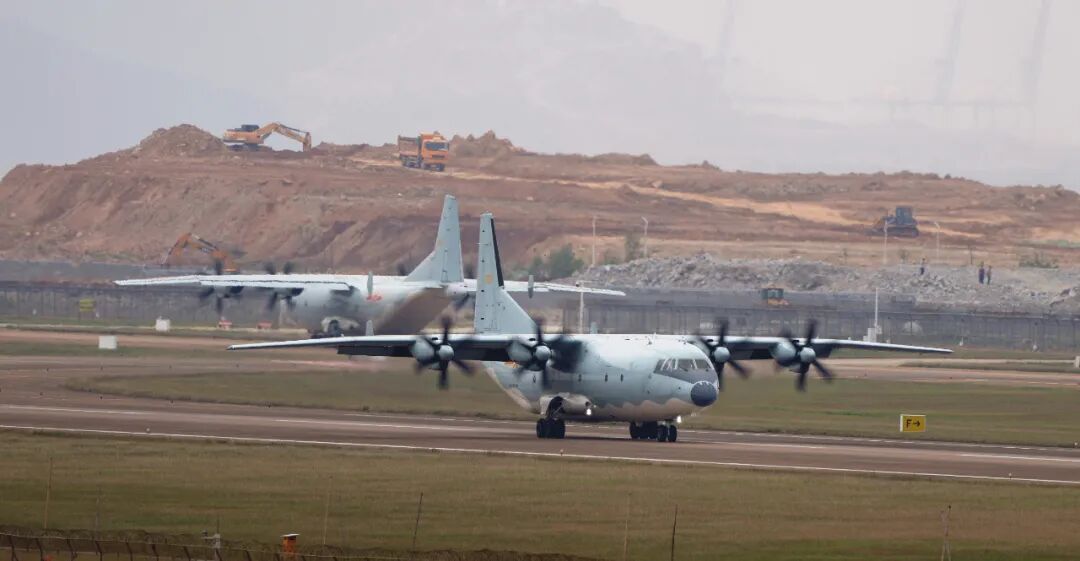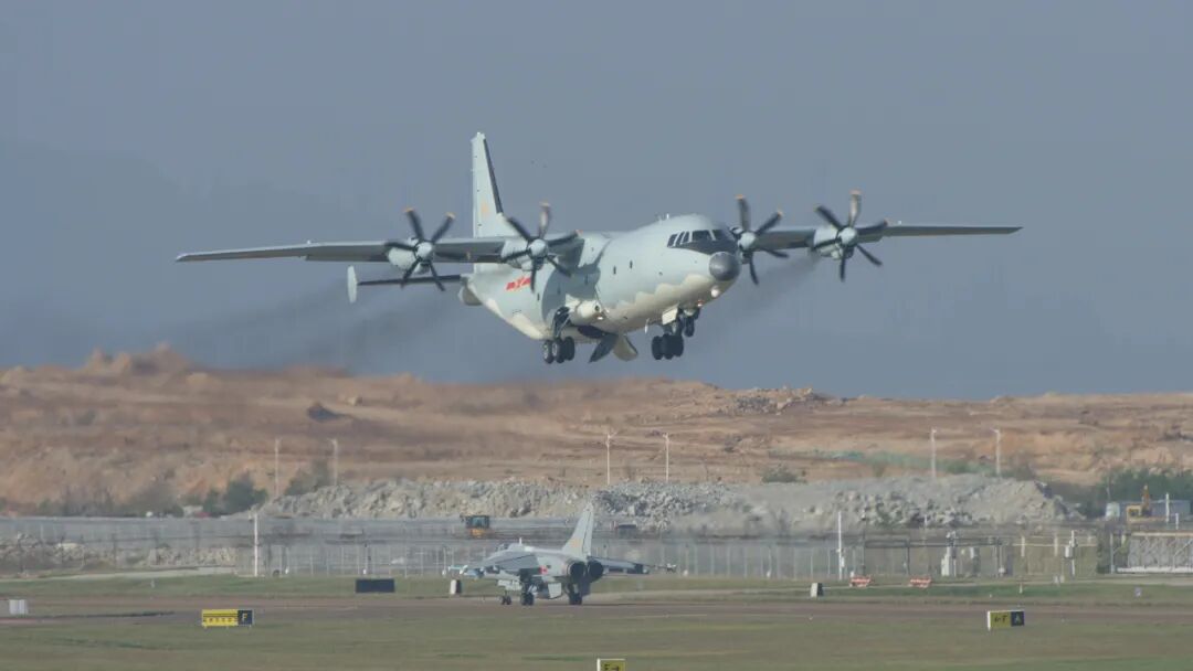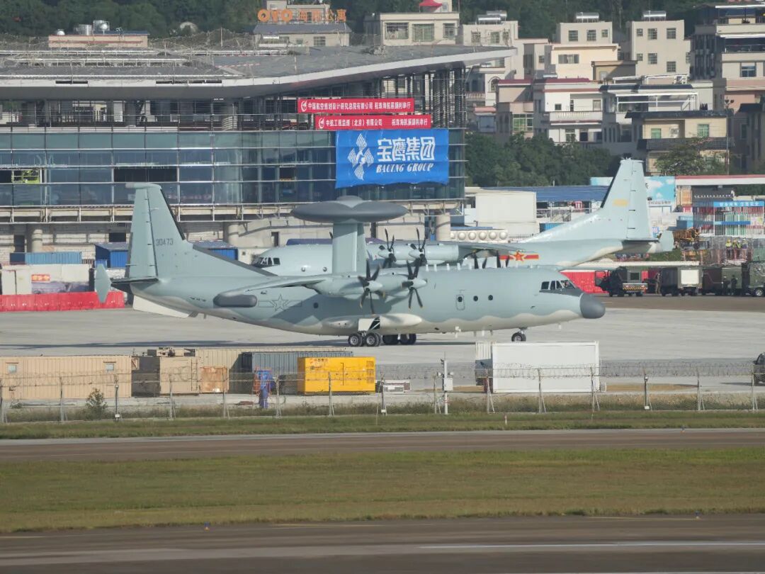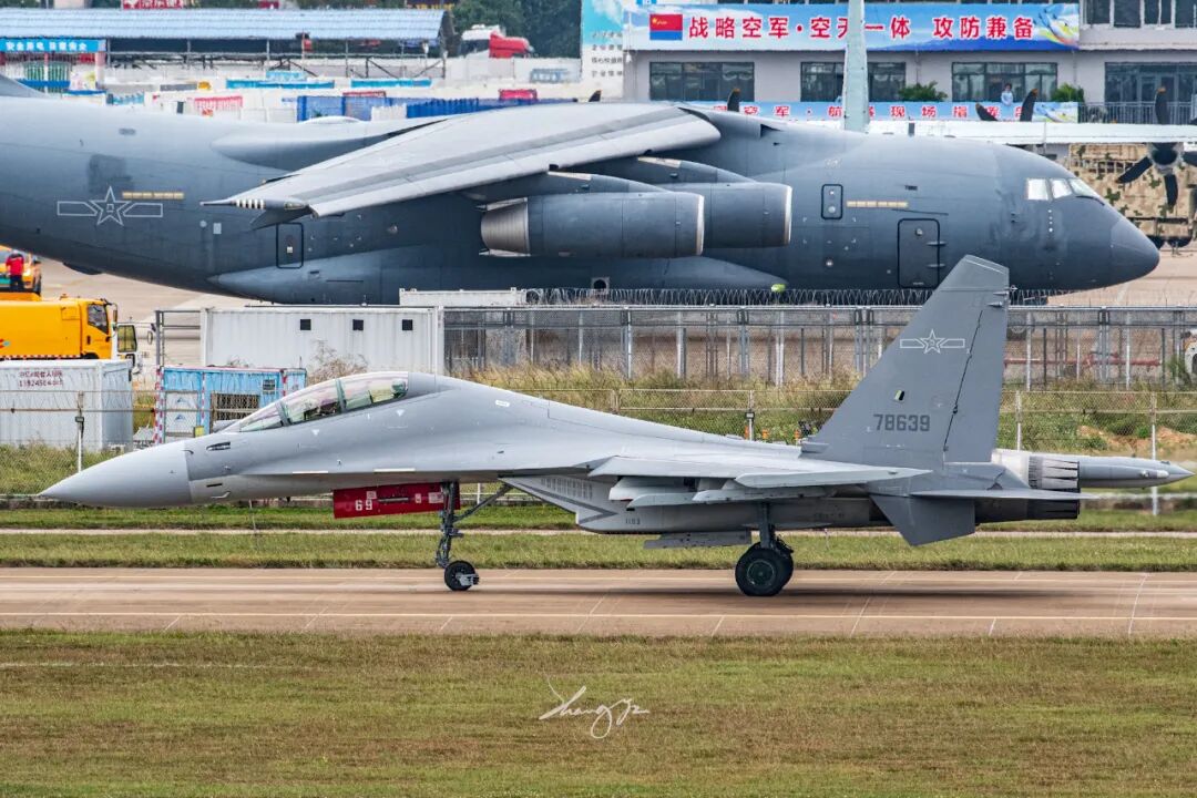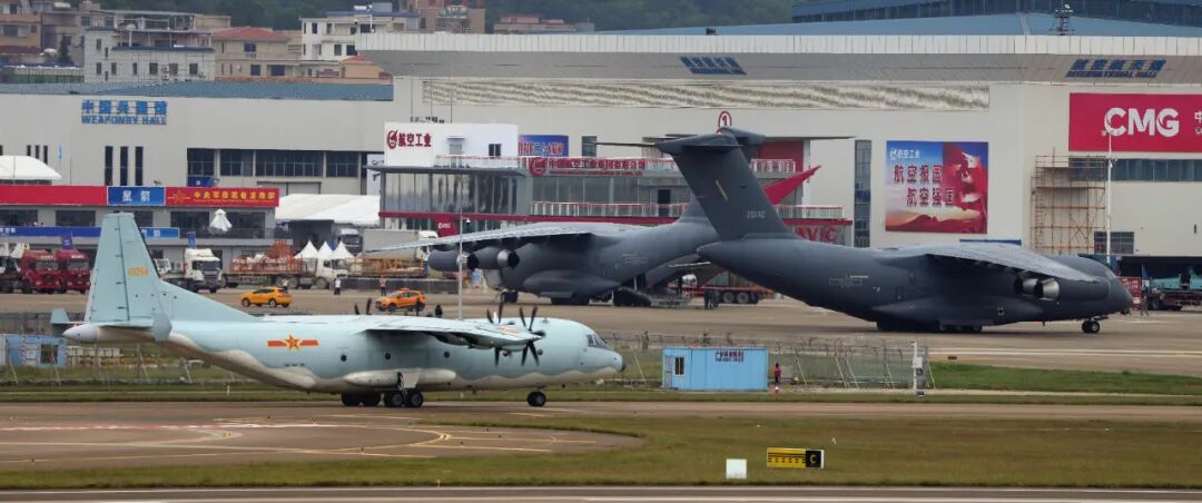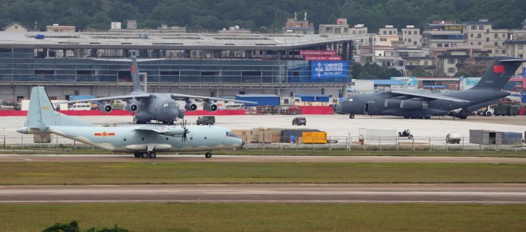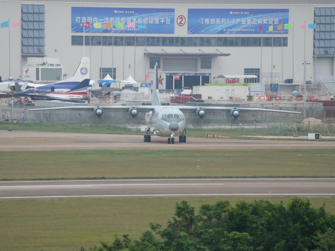 8:39,静态展示的运9起飞,背景是正在滑行的飞豹