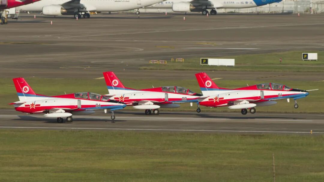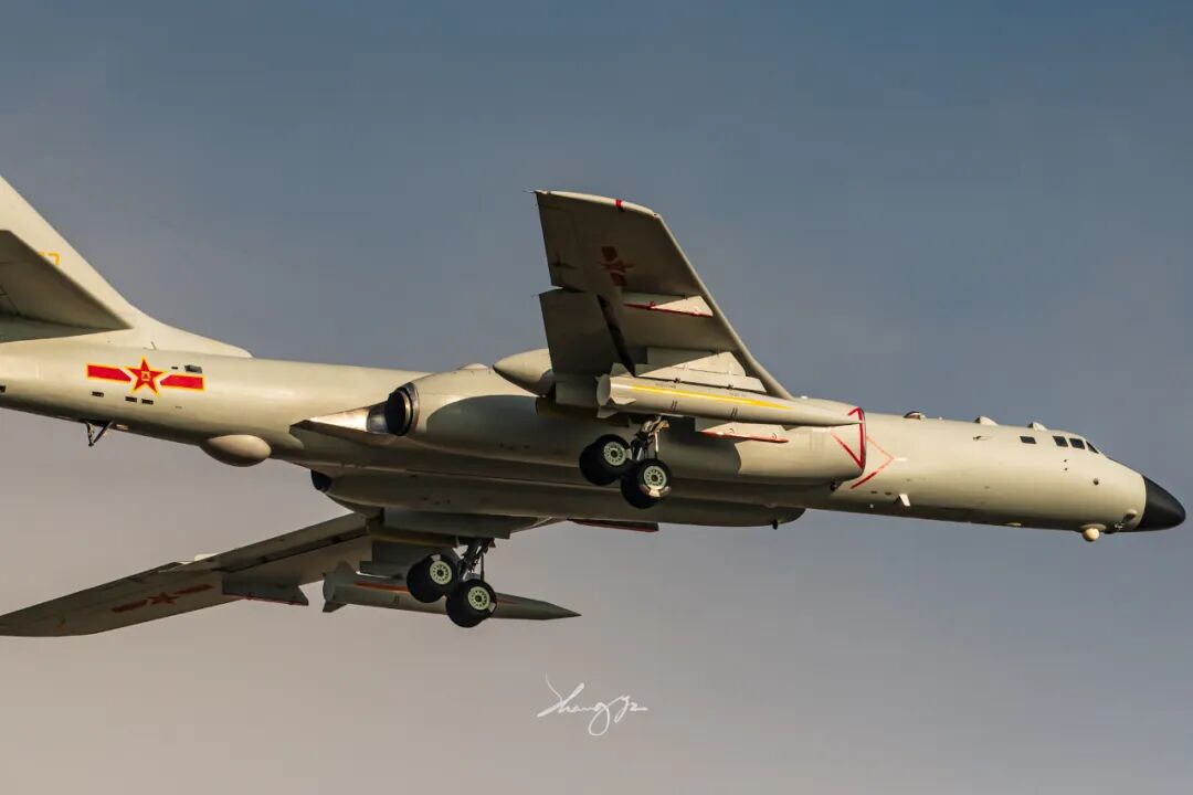 7:33,教10双机开始在跑道滑行,这两架教10都是从东北飞来的部队现役,直接飞走了。8:03,轰6K滑行上跑道。同样挂着来时的空射弹道导弹,非常威武。8:04,红鹰队升空,按照344的编队起飞,他们的目的地是南昌,将会在月底的南昌飞行大会上继续表演。