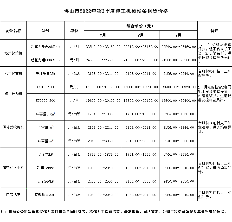佛山市2022年第3季度施工机械设备租赁价格