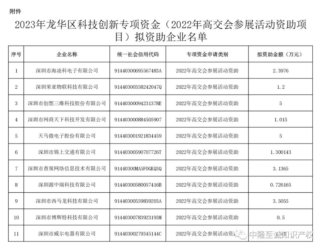 根据《深圳市龙华区科技创新专项资金实施细则(修订)》(深龙华府办规〔2020〕4号)等文件的规定,现将2023年科技创新专项资金(2022年高交会参展活动资助项目)拟资助企业名单(详见附件)予以公示,向社会广泛征求意见。
