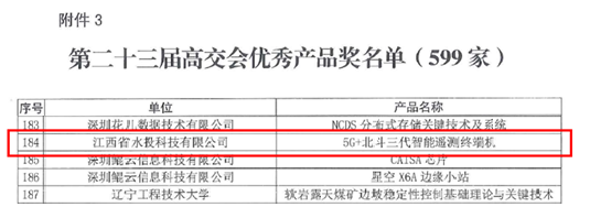 2021年12月27日至29日,第二十三届中国国际高新技术成果交易会在深圳举办,省水投科技公司自研产品“5G+北斗三代智能遥测终端机”在高交会首发亮相展出。获得第二十三届中国国际高新技术成果交易会优秀产品奖。