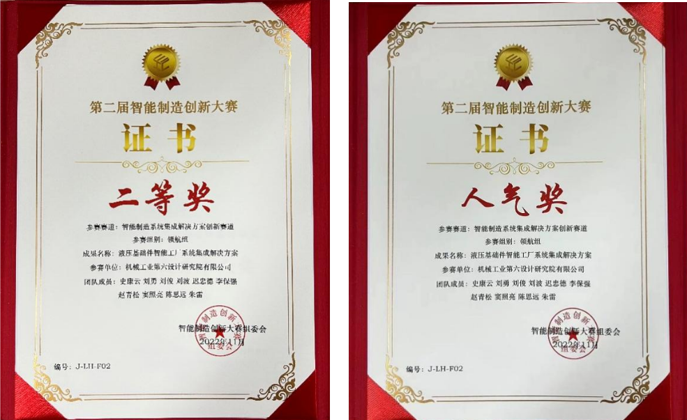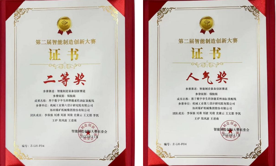 大会开幕式上,举行了第二届智能制造创新大赛全国总决赛颁奖仪式。公司参赛的液压基础件智能工厂系统集成解决方案和基于数字孪生的智能柔性油缸装配线两项目均荣获智能制造系统集成赛道和装备赛道领航组全国总决赛二等奖和人气奖。