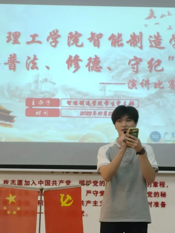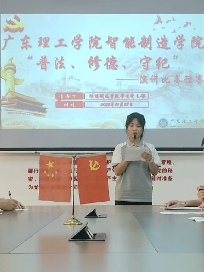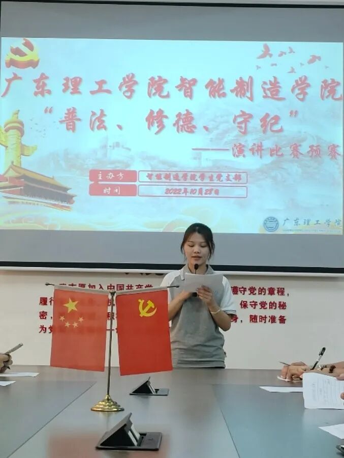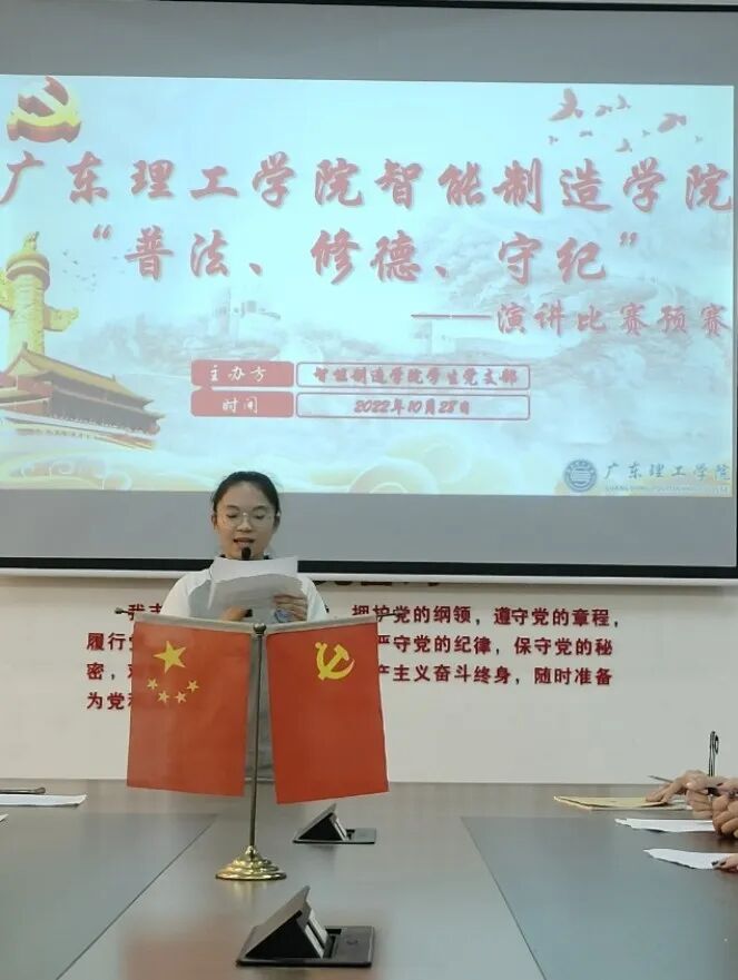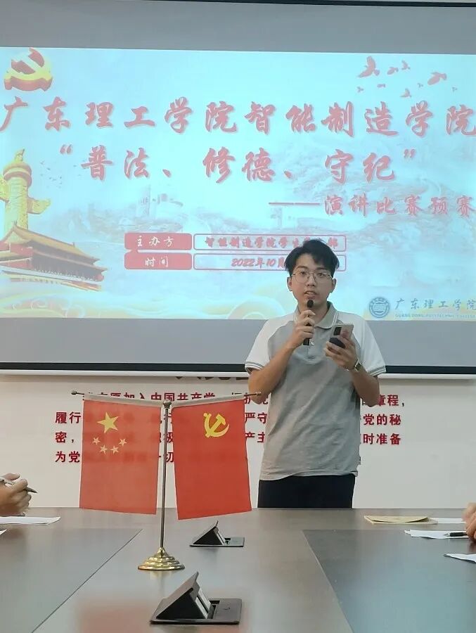 为进一步全面贯彻党的教育方针,落实立德树人根本任务,推进学校的法治教育和思想政治教育,提高我院学生的法律意识、德育观念、守纪精神,坚持和落实“依法治校,以德治校”,打造文明守纪的“平安校园、和谐校园”,智能制造学院学生党支部于2022年10月28日在9栋304教室举行“普法、修德、守纪”演讲比赛预赛。此次预赛晋级的选手将会晋级初赛,让我们来看看现场情况吧!