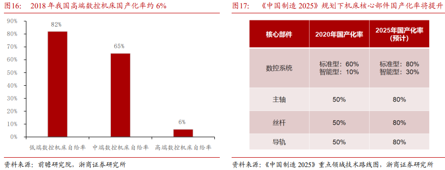 目前国内高端数控机床严重依赖进口,由于高端机床下游主要为航空、军工等高精尖领域,涉及到国家安防等领域,因此亟需国产替代。根据前瞻研究院数据,2018 年中国高端数控机床国产化率仅约6%。我国民营机床企业在效率、决策、产权等方面具备一定优势,开始成为机床行业主力军。
