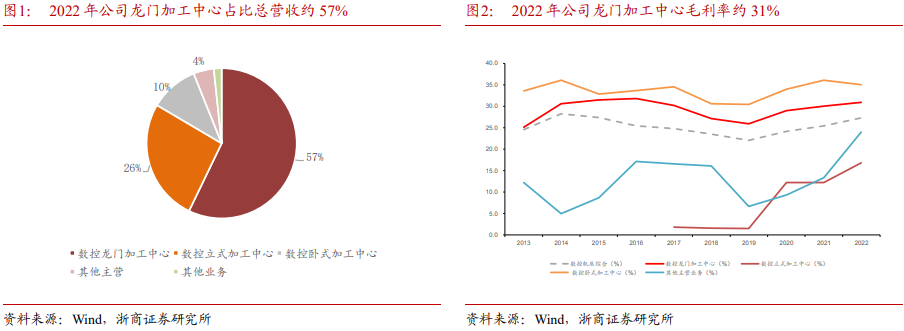 公司是国内数控机床龙头企业之一,2022年数控机床业务总营收约31.24亿元,占比总营收约98%,毛利率约为27%。细分来看,公司机床类型可为龙门加工中心、立式加工中心、卧式加工中心以及其他主营业务。2022年公司实现营收约32亿元,同比增长约16%,归母净利润约5.2亿元,同比增长约40%。