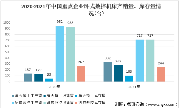 从产销量、库存量情况来看,海天精工的产销量、库存量逐年增加,纽威数控的产销量、库存量逐年下降,2021年海天精工机床的产量为332台,较上年增长142.34%,销售量为282台,较上年增长118.6%,库存量为103台,较上年增长94.34%,2021年纽威数控中卧式数控机床的产量为717台,较上年下降24.69%,销售量为717台,较上年下降23.15%,库存量为244台,较上年下降8.61%。