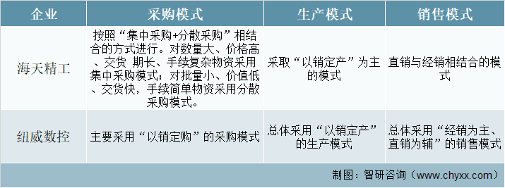 在经营模式上,两家企业根据自身情况制定了相应的模式,海天精工的采购按照“集中采购+分散采购”相结合的方式进行。生产模式采取“以销定产”为主的模式,销售模式是直销与经销相结合的模式;纽威数控主要采用“以销定购”的采购模式,采用“以销定产”的生产模式,采用“经销为主、直销为辅”的销售模式。