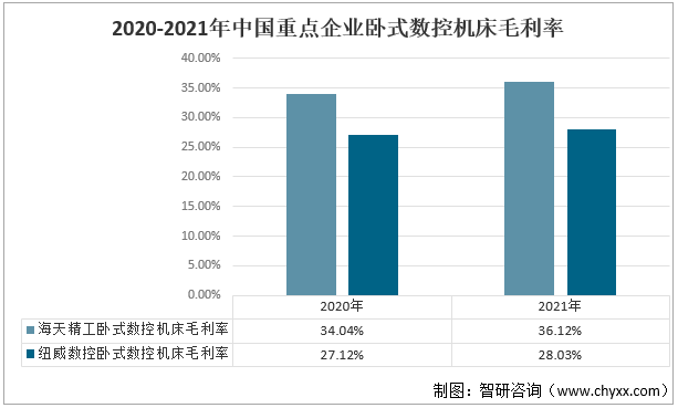 从2020-2021年卧式数控机床占总营业收入的比重来看,纽威数控中卧式数控机床占营收的比重高于海天精工,海天精工卧式数控机床占营业收入的比重逐年上升,纽威数控占营收的比重下降幅度不大,2021年海天精工卧式数控机床占总营业收入的比重为15.96%,纽威数控占比22.88%。