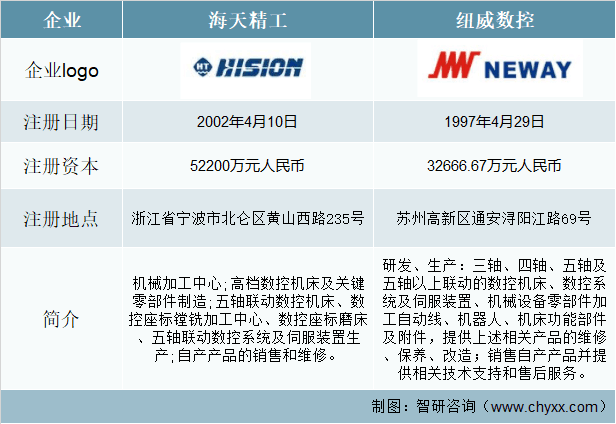 海天精工自成立以来致力于高端数控机床的研发、生产和销售,主要产品包括数控龙门加工中心、数控卧式加工中心、数控卧式车床、数控立式加工中心、数控落地镗铣加工中心、数控立式车床。纽威数控主营业务为中高档数控机床的研发、生产和销售,主要产品包括大型加工中心、立式卧式数控机床、卧式数控机床、其他机床及附件等。