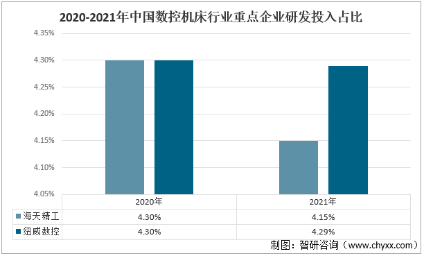 从研发投入占营收比重情况来看,纽威数控的研发投入占比高于海天精工,2021年海天精工的研发投入占比为4.15%,纽威数控的研发投入占比为4.29%。