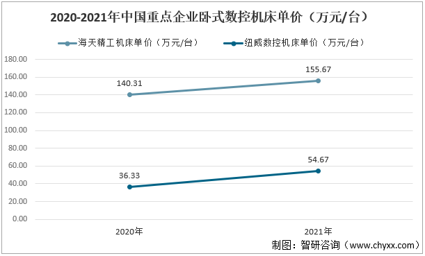 根据2020-2021年两家企业卧式数控机床销售单价情况来看,海天精工卧式机床的单价高于纽威数控。海天精工和纽威数控的卧式数控机床的单价都呈现上升趋势, 2021年海天精工卧式数控机床的销售单价为155.67万元/台,较上年增长10.95%,纽威数控的数控机床销售单价为54.67万元/台,较上年增长50.47%。