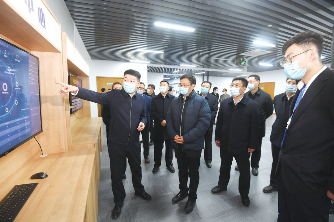 图为副省长汤志平在吕梁经济技术开发区数字产业园区华为大数据中心调研大数据产业发展和新型智慧城市建设情况。