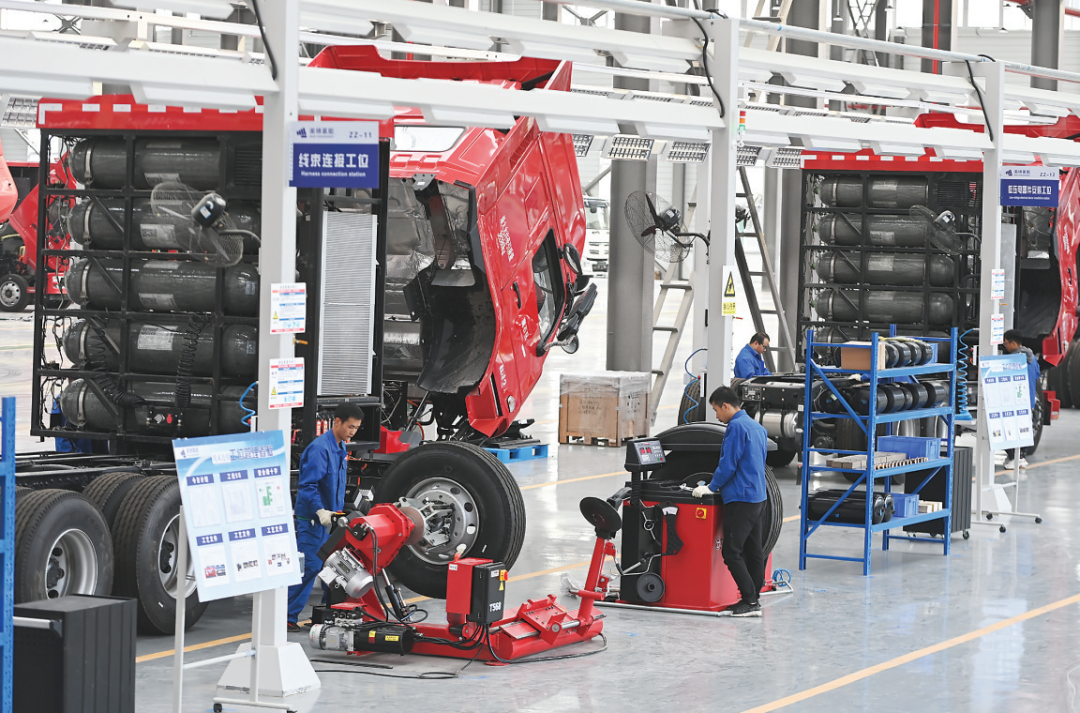 图为美锦氢燃料商用车整车生产线上,工人正在对氢燃料电池重卡进行装配、调试。