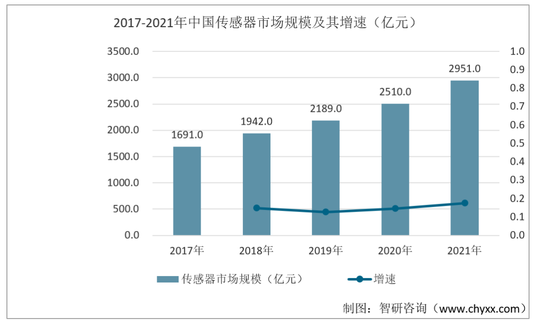传感器是一种检测装置,能感受到被测量的信息,并能将感受到的信息,按一定规律变换成为电信号或其他所需形式的信息输出,以满足信息的传输、处理、存储、显示、记录和控制等要求。数据显示,我国传感器市场规模由2017年的1691亿元增至2020年的2510亿元,年均复合增长率14.1%,2021年市场规模达2951.0亿元。随着社会的不断进步,传感器产业在互联网的赋能下日益受到重视。