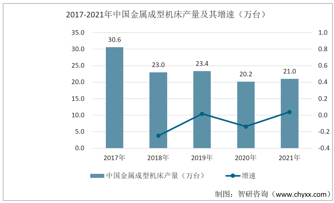 金属成型机床一般指锻压设备,是一种在锻压加工中用于成形和分离的机械设备,主要通过对金属施加压力使之成形。数据显示,2021年中国金属成型机床产量达21.0万台,同比增长0.5%。