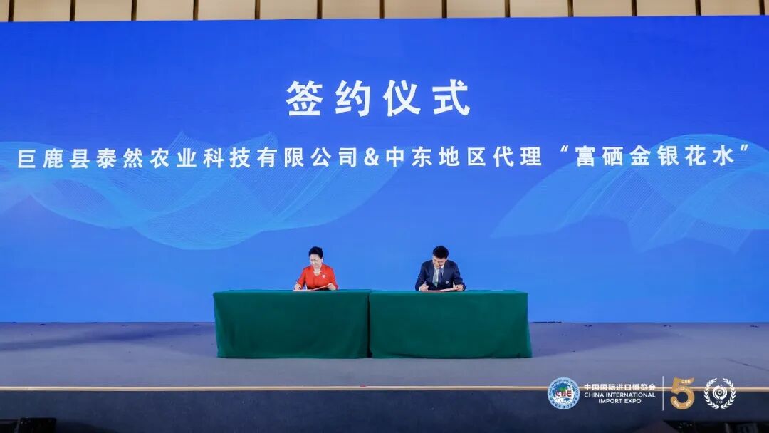 在当天的论坛上,巨鹿县泰然农业科技有限公司与中东地区代理“富硒金银花水”举行签约仪式。