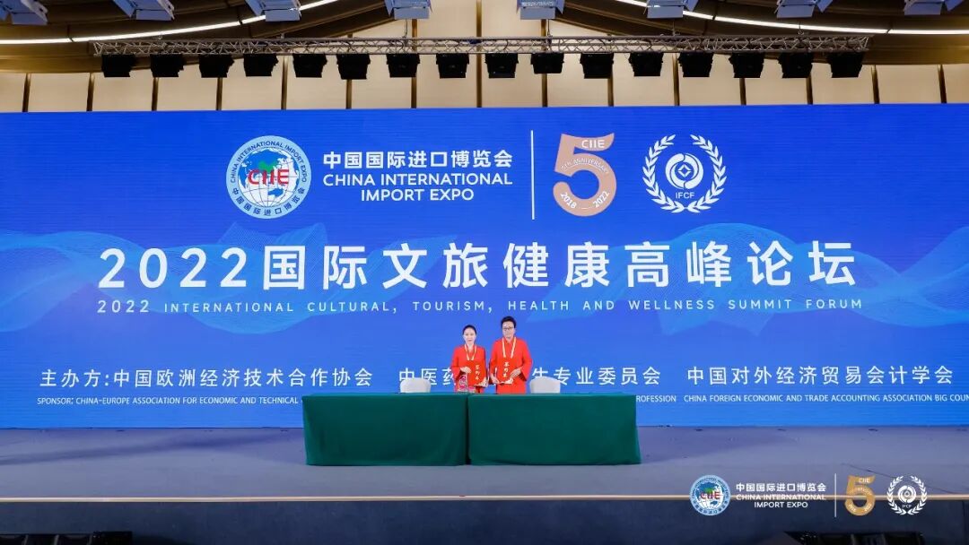 2022年11月8日 ,第五届中国国际进口博览会——2022 国际文旅健康高峰论坛在上海国家会展中心成功举办。该论坛在中华人民共和国商务部支持下,由中国欧洲经济技术合作协会、中国对外经济贸易会计学会、当代中医药发展研究中心中医药健康养生专业委员会、《大国品牌》联合主办,北京联合丝路国际文化发展有限公司 、北京玉帛堂健康管理有限公司 、大国文化有限公司 、中国太赫兹医学研究院等单位共同承办。来自国内外政府部门和机构代表、科研院校所相关专家、文旅和健康行业代表、产业金融机构代表出席论坛,围绕“产业合作,促进文旅健康融合发展”展开深度交流。