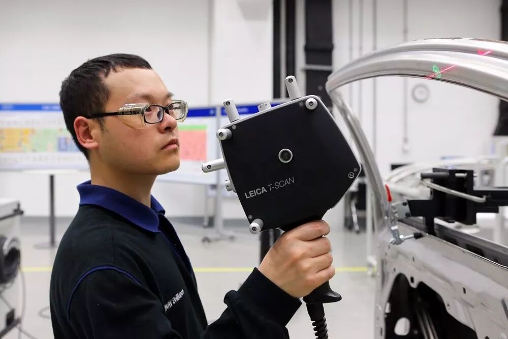 冲压车间里,激光扫描仪正在以210,000点/秒的速度对车身零件表面的尺寸进行扫描检测,得到点云数据,通过与3D数模的对比,可以得出车身尺寸状态。