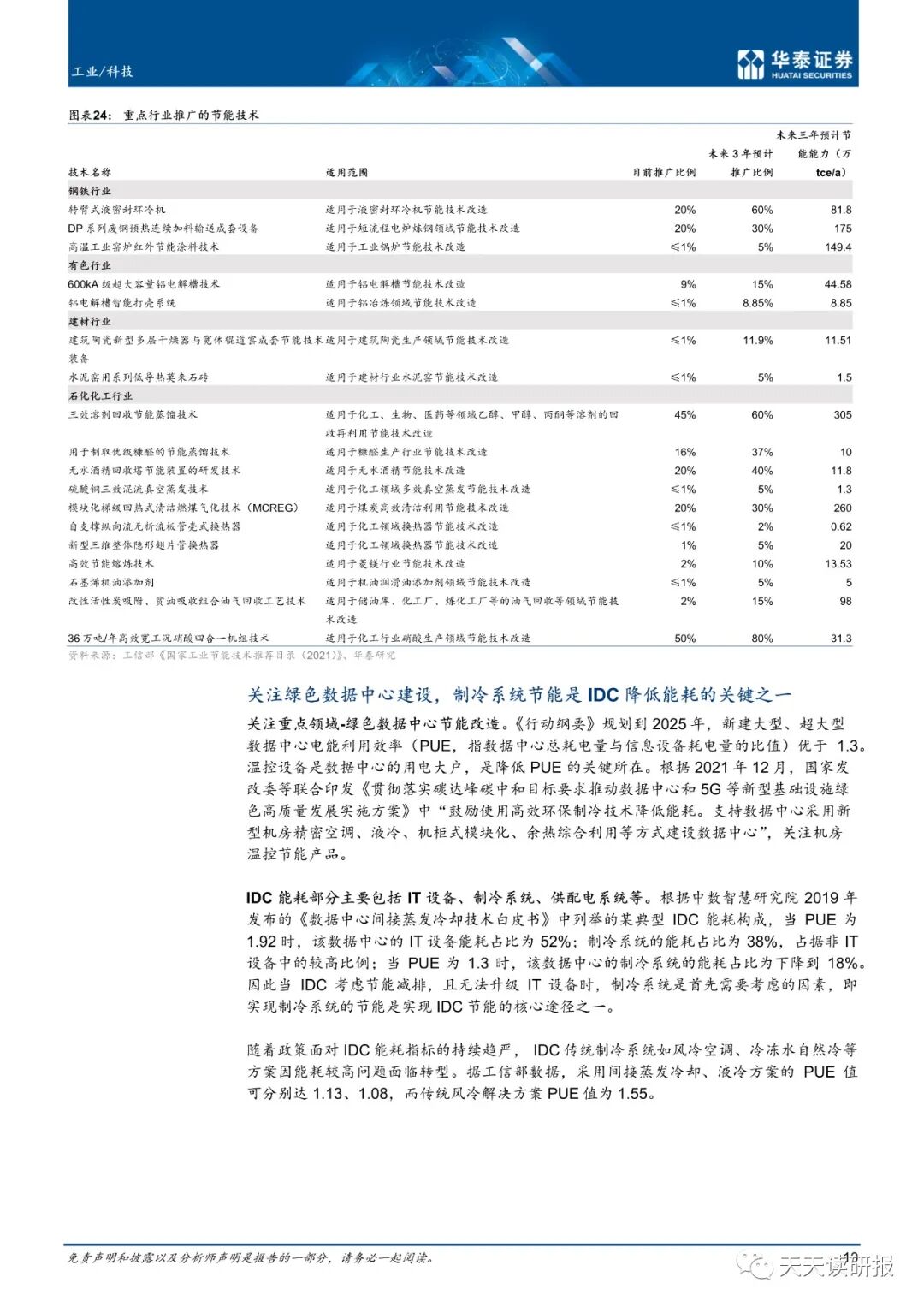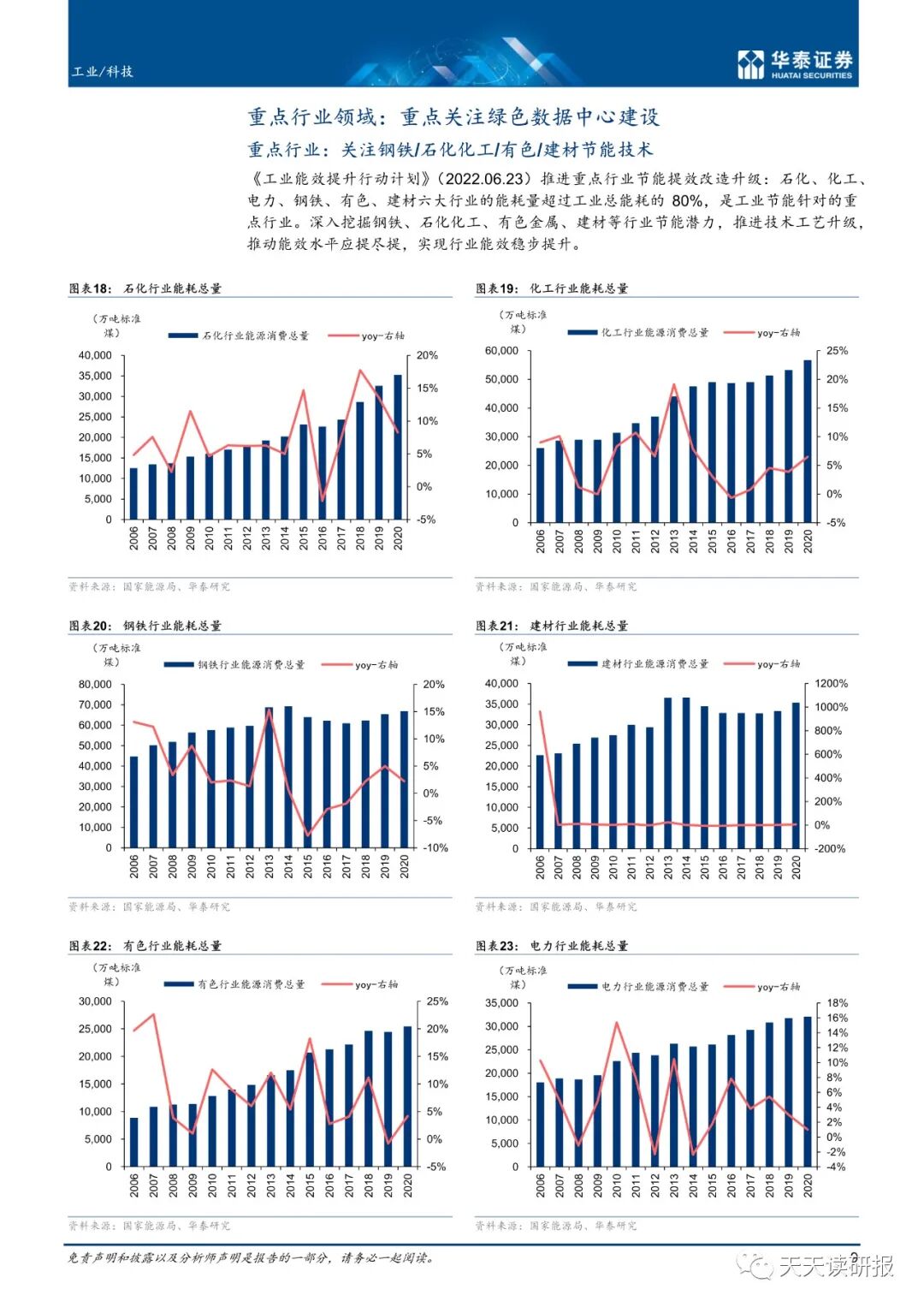 统筹优化工业用能结构、数字赋能等对节能提效的促进作用,全面提升工业能效基础。9 月 28 日央行向包括“重点领域节能降碳改造升级”在内的十个领域设立设备更新改造专项再贷款。我们看好:1)绿色数据中心建设,尤其是制冷系统节能;2)高效节能电机及系统(含风机/泵/压缩机)技术升级和进口替代需求;3)工业用户多能互补,余热利用市场空间广阔。