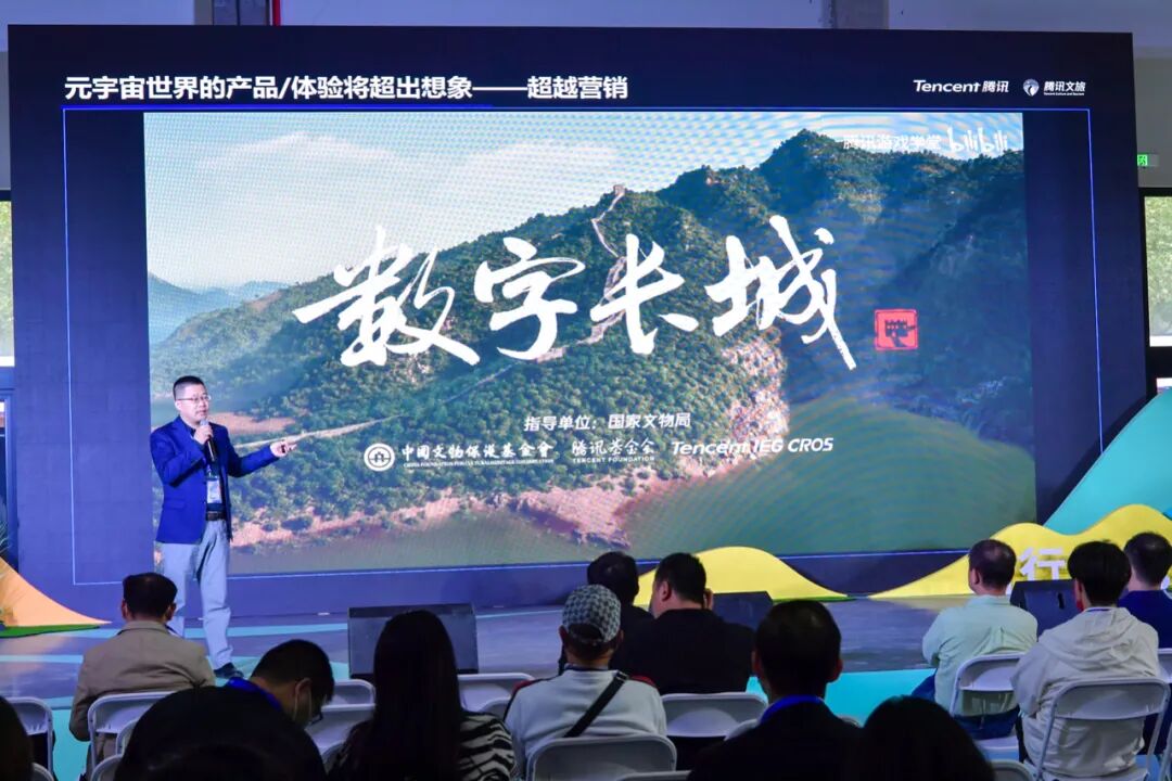 腾讯云文旅行业副总经理王家贺先生带来主题演讲分享,“元宇宙营销场景应用趋势”,从“人-货-场-事”四要素向我们展示了腾讯通往全真互联的未来之路。现场展示了国家博物馆首个虚拟数字人“艾雯雯”元宇宙偶像“AI艾灵”“数字长城”等虚拟数字形象。王家贺先生表示腾讯希望在全真互联的道路上以数强实,打破流量壁垒激活存量新能量。