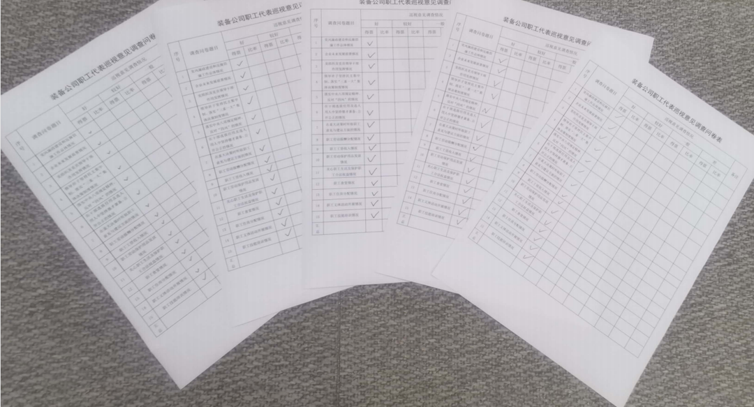 五是全面建立劳动争议调解委员会,认真落实职工代表巡视制度。协助处理劳动关系纠纷,维护职工队伍和谐稳定。定期召开职工座谈会,通过填写《职工代表巡视意见调查问卷表》,就党员干部作用的发挥情况、重大决策时听取的职工意见与建议、职工劳动报酬、职工收入、食堂及住房等多方面进行民主测评,进一步了解掌握职工的工作和思想动态。