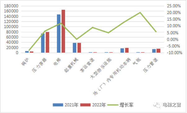 同比2021年,2022年特种设备数量变化较大的是锅炉、气瓶、场(厂)内专用机动车辆和电梯。锅炉减少525台,降幅8.25%,气瓶增加60余万只,增幅20%,场(厂)内专用机动车辆增加2万余台,增幅12.9%,电梯增加1万7千余部,增幅12%。