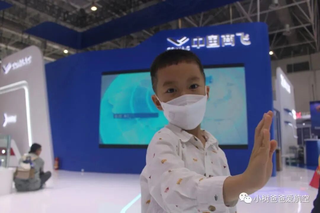 小树在商飞展台看C919的研制历程视频,看了好久,看完了高兴的用手比划飞机的飞行过程。