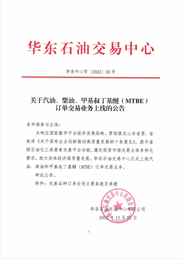 近日,水发集团所属华东石油交易中心发布公告,为提升省级石油化工类要素交易平台功能,满足现货市场交易主体多样化需求,助力实体经济高质量发展,华东石油交易中心正式上线汽油、柴油和甲基叔丁基醚(MTBE)订单交易业务。