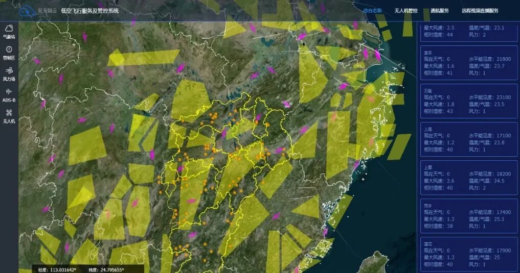 综合态势分系统作为低空的综合管制、监控及统筹管理基础平台,综合展示低空空域运行航空器的位置、状态等相关信息,实现军方、民航、公安等监管方对低空空域的有效监视监管及低空飞行企业与个人用户的飞行情报可视化。平台对飞行情报进行一体化展示,同时提供图层管理及地图绘制测量功能,支持管理部门进行低空态势评估和决策辅助。