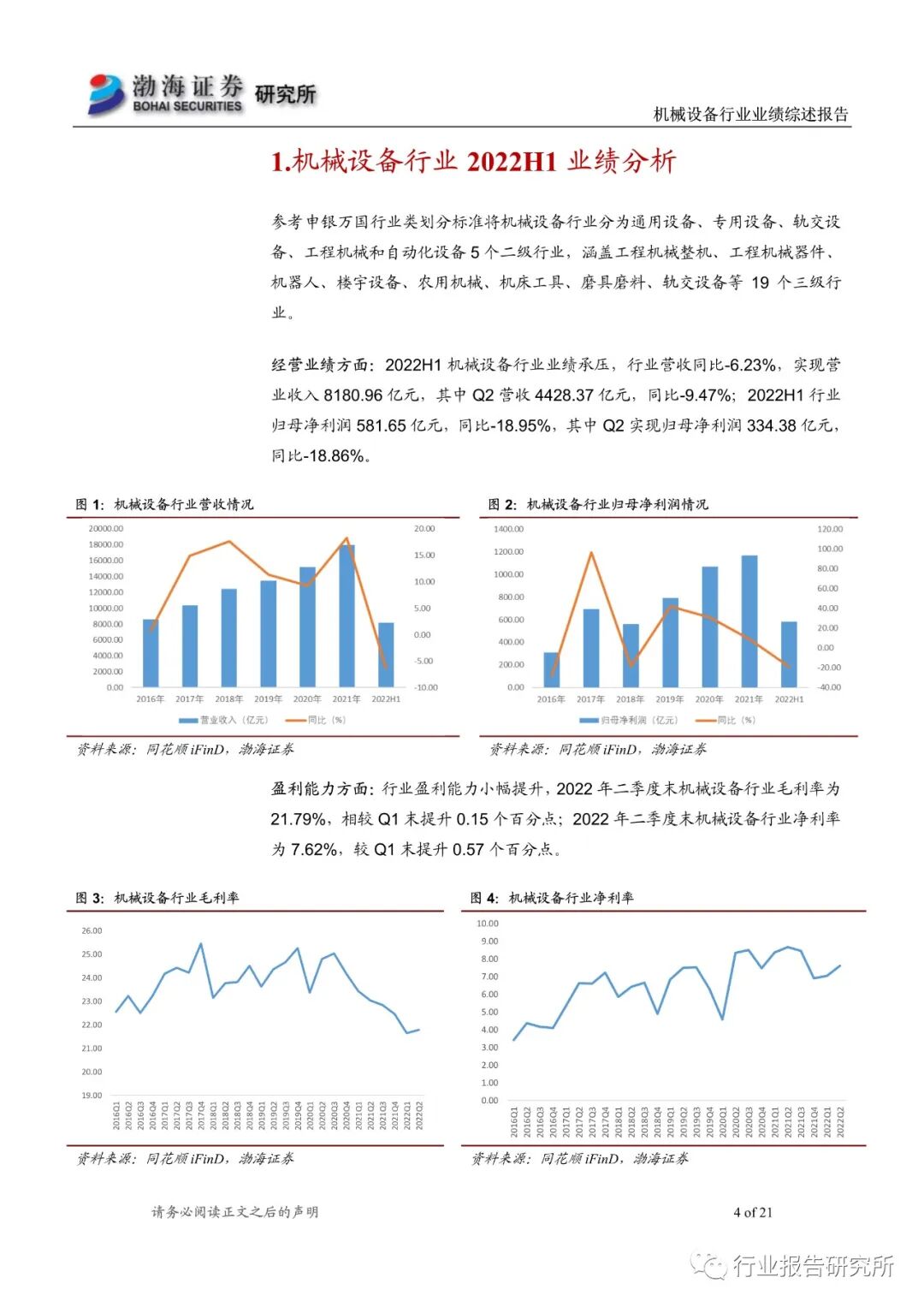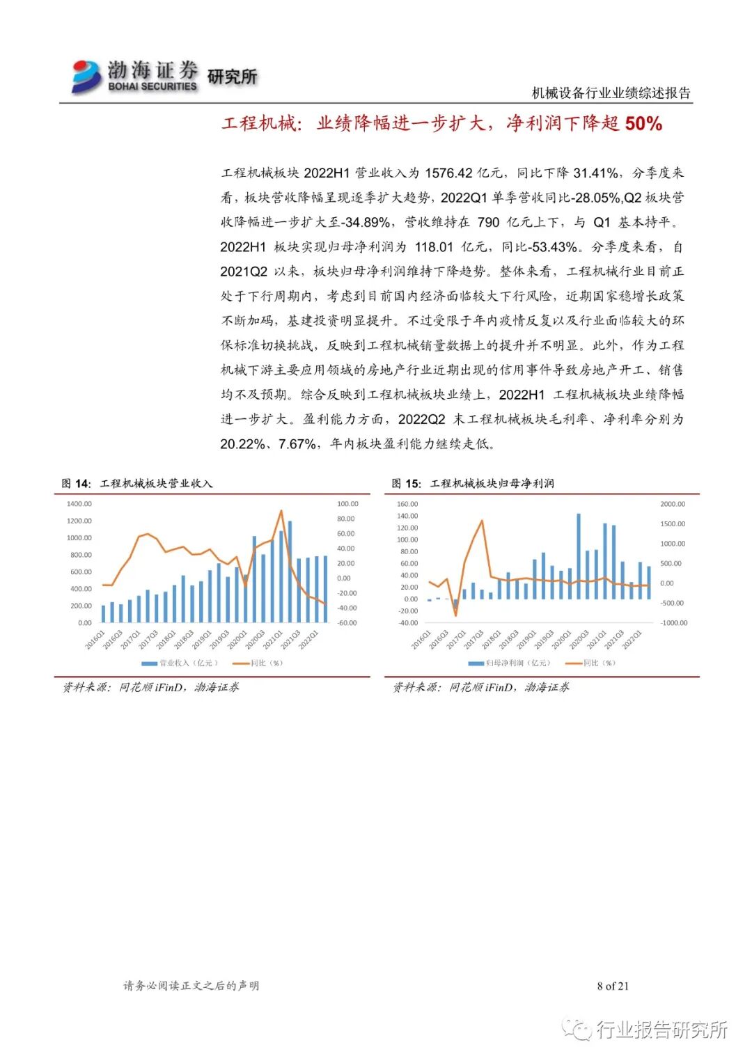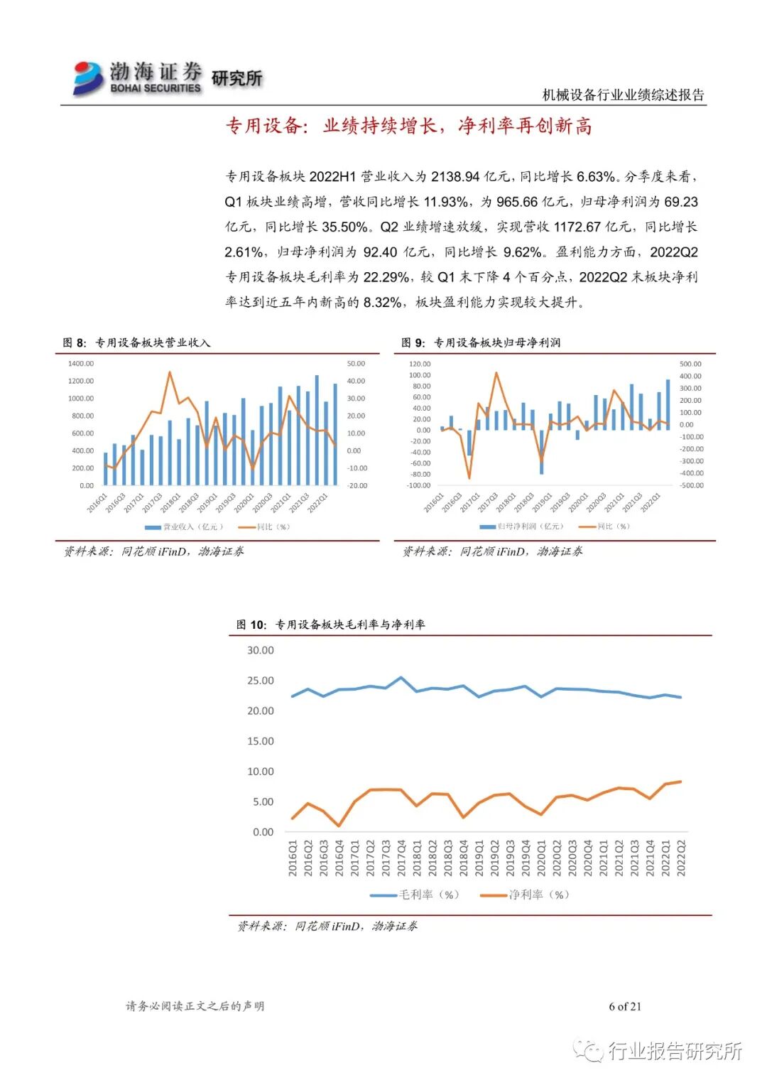 12022H1 机械设备行业实现营业收入 8180.96 亿元,同比-6.23%;归母净利润为 581.65 亿元,同比-18.95%。2)Q2 行业业绩承压,实现营收 4428.37亿元,同比-9.47%;实现归母净利润 334.38 亿元,同比-18.86%3Q2 业盈利能力小幅提升,行业毛利率、净利率分别提升 0.150.57 个百分点。4)子行业中专用设备板块表现亮眼,板块净利率再创新高,工程机械板块业绩降幅进一步扩大,净利润降幅超 50%