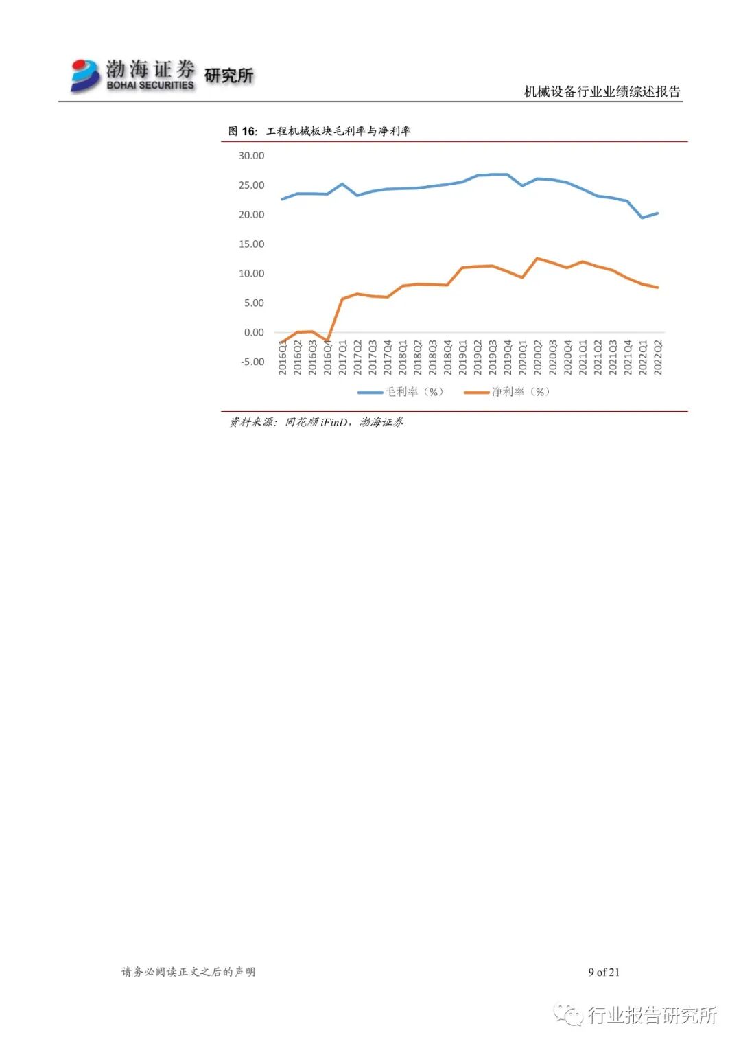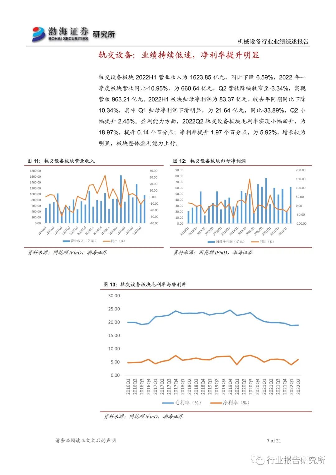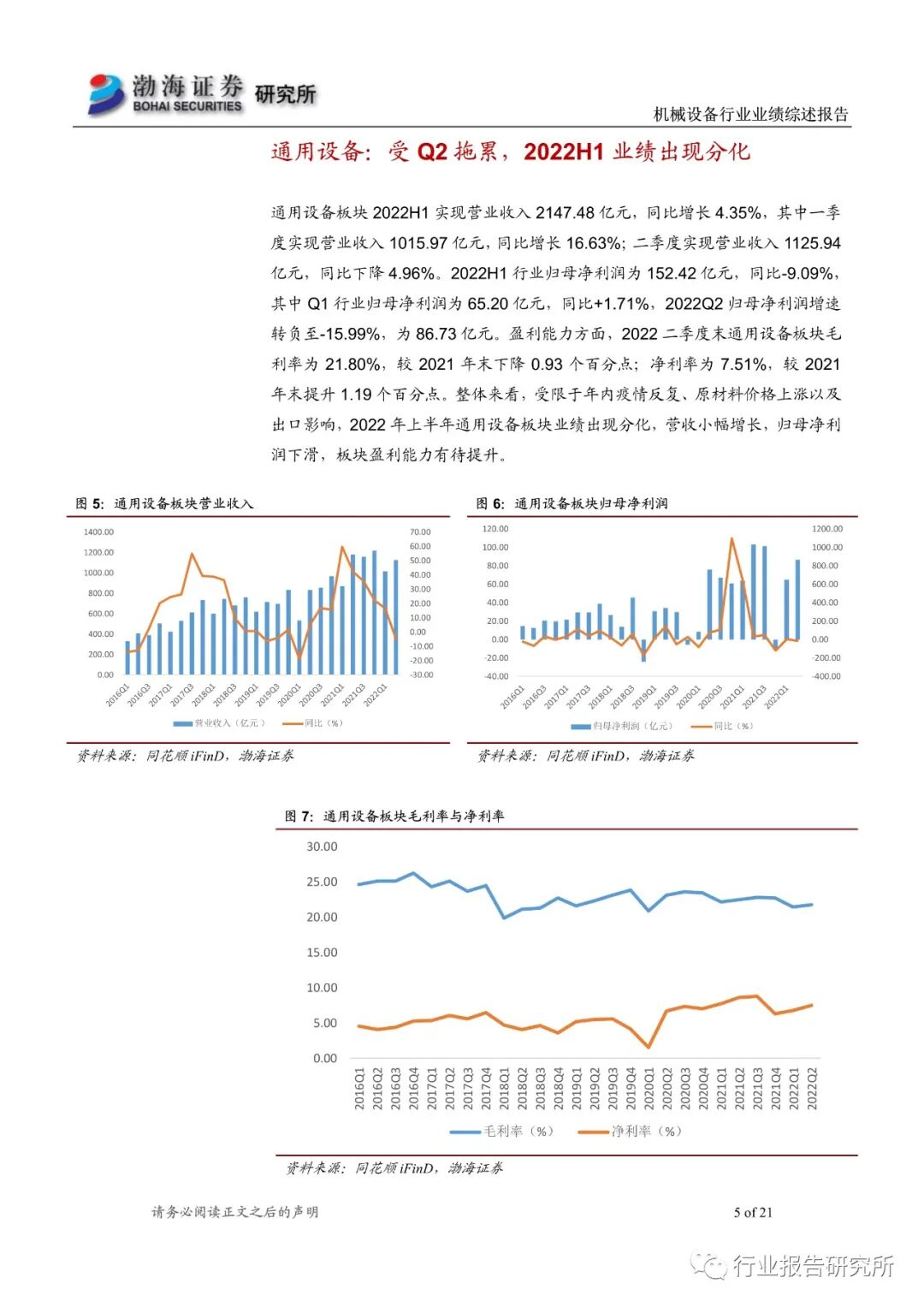 12022H1 机械设备行业实现营业收入 8180.96 亿元,同比-6.23%;归母净利润为 581.65 亿元,同比-18.95%。2)Q2 行业业绩承压,实现营收 4428.37亿元,同比-9.47%;实现归母净利润 334.38 亿元,同比-18.86%3Q2 业盈利能力小幅提升,行业毛利率、净利率分别提升 0.150.57 个百分点。4)子行业中专用设备板块表现亮眼,板块净利率再创新高,工程机械板块业绩降幅进一步扩大,净利润降幅超 50%
