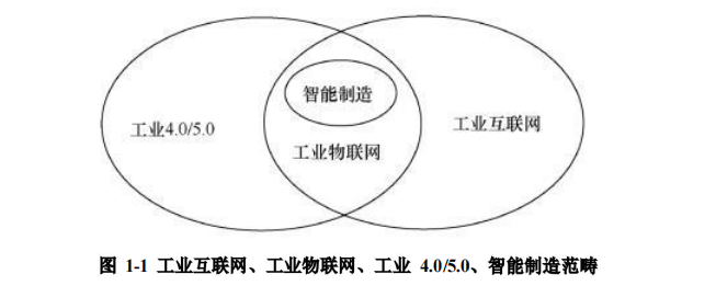 通过以上对工业互联网与 IIoT、工业 4.0/5.0、智能制造联系与区别的总结可以看出它们之间范畴的差异。工业互联网、工业 4.0/5.0 包含了“人−机− 物”的全面互联,都以智能制造为主导,但工业互联网更关注产品本身的智能化而工业 4.0/5.0 的核心更注重互联,工业物联网是物与物、机器与机器的连接。工业互联网涵盖了工业物联网,工业互联网是工业 4.0/5.0 的技术支柱之一,是实现智能制造的关键使能技术,而智能制造又是工业互联网与工业 4.0/5.0 的核心动力源,工业互联网、工业物联网、工业 4.0/5.0、智能制造范畴如图 1- 1 所示。通过对工业互联网概念的深刻理解,可以看出其对推动工业 行业的发展有着举足轻重的作用,在制造业、产业经济发展中蕴藏巨大潜力,将工业互联网融入各行业刻不容缓。然而从理论到应用还需要不断地探索,尤 其是构建完善的工业互联网体系架构对工业产业数字化、智能化转型升级有着重要的指导作用。