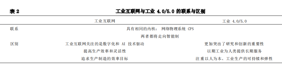德国政府于 2013 年正式提出工业 4.0:利用网络物理生产系统(CPPS, cyber-physical production system) 将制造、物流及销售等信息数字化,并集中使用全球可用的信息网络进行自动化信息交流以实现生产和业务流程的匹配,最终完成高效、个性化的服务。在工业 4.0 概念的基础上,欧盟委员会于 2021 年正式提出了工业 5.0 的概念, 除了数字化与智能化, 更加关注以人为本的需要。工业 5.0 不仅补充了工业互联网的标志性功能,还强调将工业置于环境或社会等非经济或技术层面。工业互联网与工业 4.0/5.0 的联系与区别如下表所见。