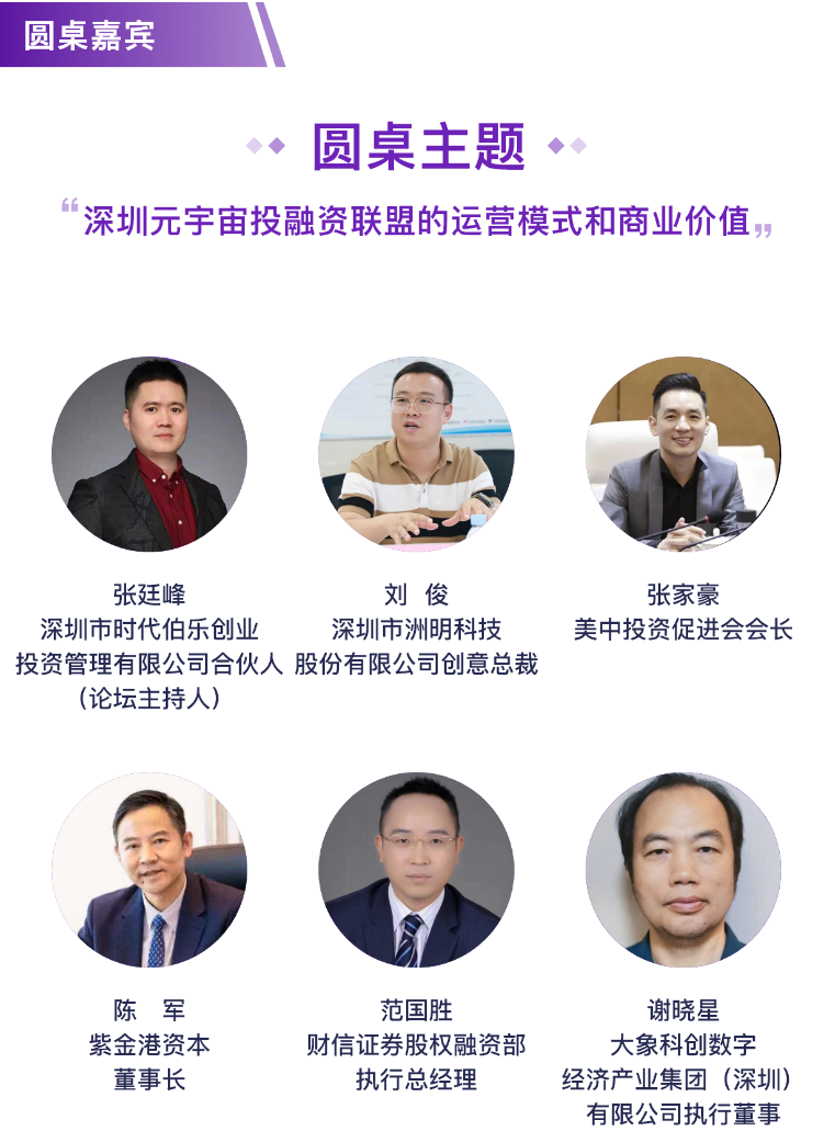 由深圳市虚拟现实产业联合会、美中投资促进会、宝安产业引导基金、盛世投资、时代伯乐、东方富海、洲明科技、万兴科技、戴尔科技集团、北京银行、大象投资、青橙资本、西堤资本等协会、产业、资本共同发起的深圳元宇宙投融资联盟成立仪式也将成为大会上的重量级高光时刻,通过元宇宙投融资联盟,将汇聚起“产学研用金”多领域的推手力量,为深圳、华南乃至全国的新锐企业引荐潜在投资人并确定可能的投资人,从而牵线伯乐与千里马,为好项目找到最佳助力,为投资找到最好落点。