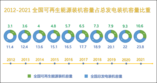 碳达峰碳中和事关中华民族的永续发展和构建人类命运共同体,能源发展既要保障安全,也要推进转型。十八大以来,在新发展理念的引领下,我国能源绿色低碳转型的步伐不断加快,发展的质量和效益大幅提升,近十年以年均3%的能源消费增速支撑了年均6.6%的经济增长,能源的消耗强度累计下降了26.4%。2021年,非化石能源消费比重达到了16.6%,比2012年提高了6.9个百分点。通过实施煤电超低排放和节能改造工程,90%以上的煤电机组达到了和天然气发电相当的排放水平,煤炭消费的比重已经降至56%,比2012年降低了12.5个百分点。可再生能源发电总装机已经突破11亿千瓦,比10年前增长近3倍,占全球可再生能源装机总量的比重超过了30%。水电、风电、光伏、生物质发电的装机规模和在建核电装机规模稳居世界第一。
