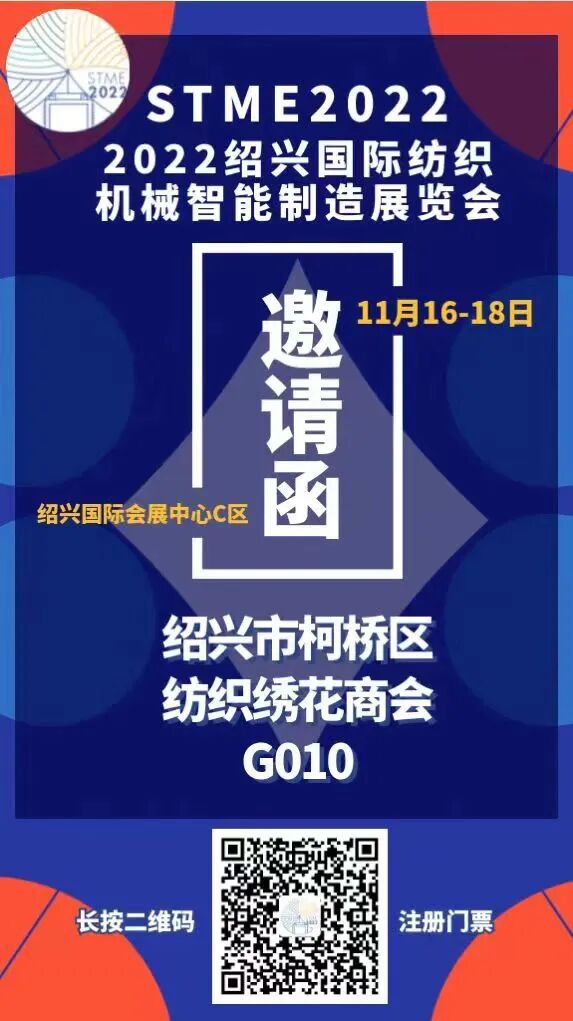 绍兴市柯桥区纺织绣花商会首次联展亮相,作为覆盖全产业链的纺织机械展示交易平台,2022年绍兴国际纺织机械智能制造展览会即将再度携手广大业界同仁,共同开启行业发展的全新里程,2022年11月16日-18日,绍兴国际会展中心C区,期待与您共赴年度盛会!