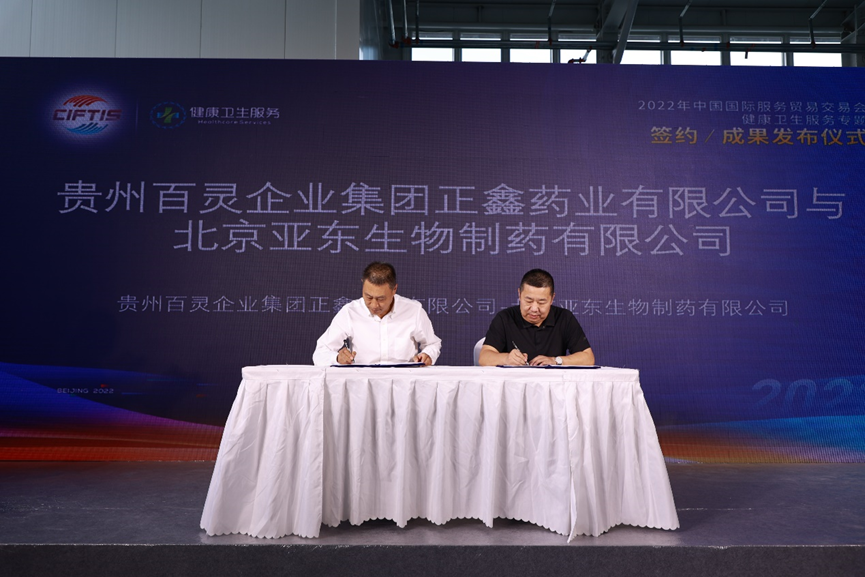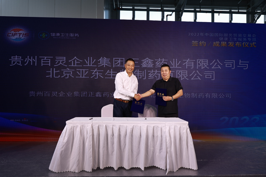 北京亚东生物制药有限公司-贵州百灵企业集团正鑫药业有限公司签约。涵盖亚东集团与贵州百灵企业集团制药股份有限公司关于感冒灵等13个产品研发成果项目合作。