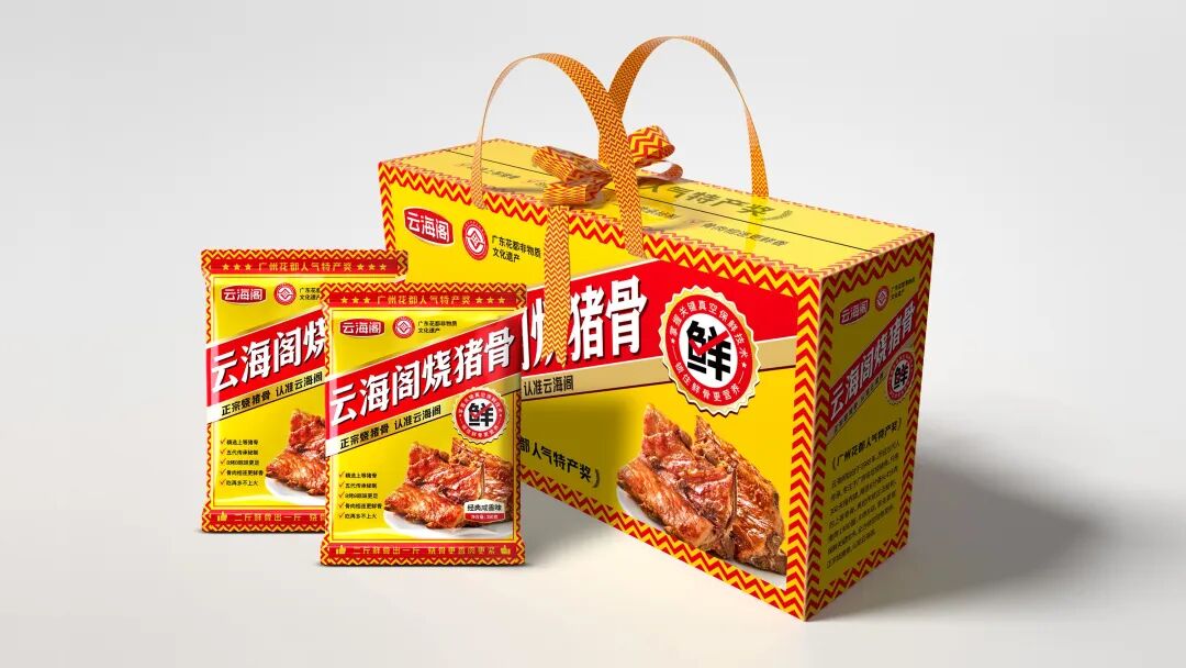 华思从云海阁的实际需求,结合市场环境为其重新定位品牌,将云海阁与烧猪骨锁定,霸占烧猪骨品类,形成“正宗烧猪骨,认准云海阁”的品牌唯一认知。通过对产品陈列终端环境的考量,打造云海阁产品包装超级花边,帮助其在终端快速被识别记忆播传。
