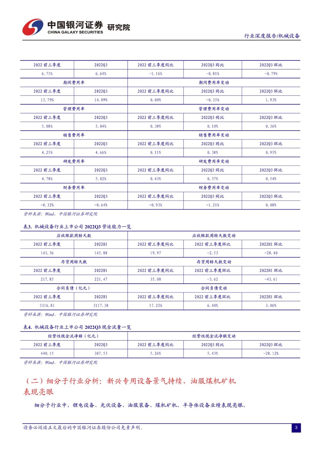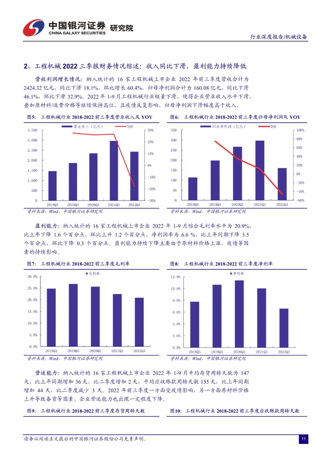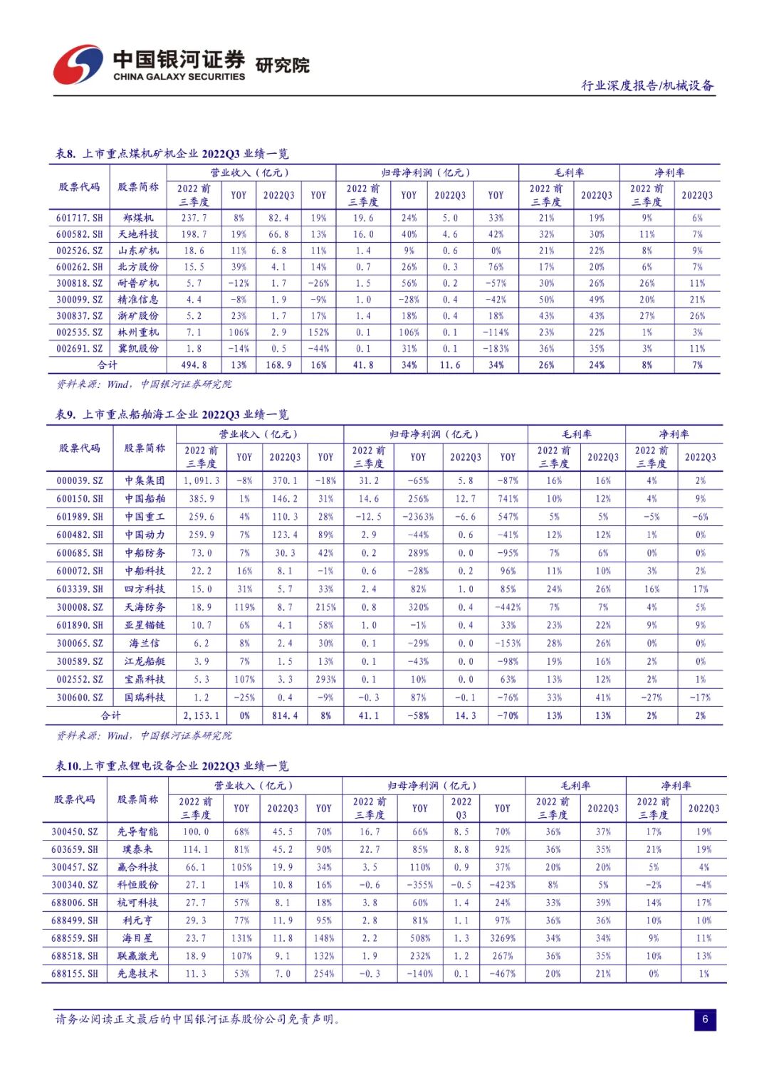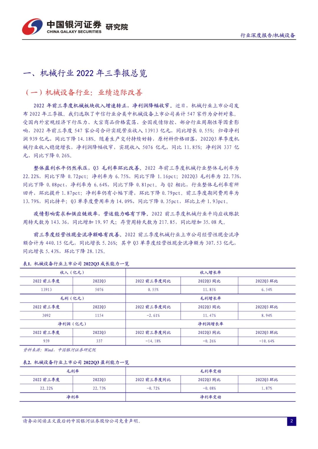 2022 年前三季度机械板块收入增速转正,净利润降幅收窄。近日,机械行业上市公司发布 2022 年三季报。我们选取了中信行业分类中机械设备上市公司共计 547 家作为分析对象。受国内外宏观经济下行压力、大宗商品价格震荡、全国疫情防控、部分行业周期性等因素影响,2022 年前三季度 547 家公司合计实现营业收入 13913 亿元,同比增长 0.55%;归母净利润 939 亿元,同比下降 14.18%。随着生产交付持续好转,原材料价格回落,2022Q3 单季度机械行业收入稳健增长,净利润降幅收窄,实现收入5076 亿元,同比 11.85%;净利润 337 亿元,同比下降 0.26%。