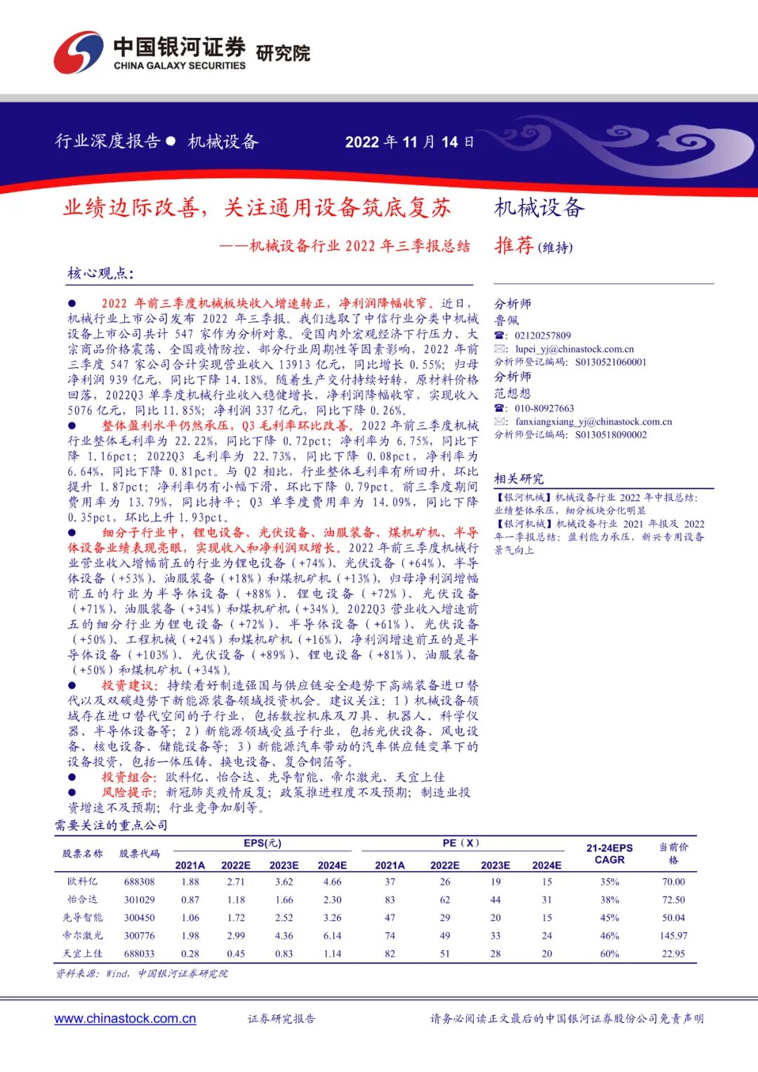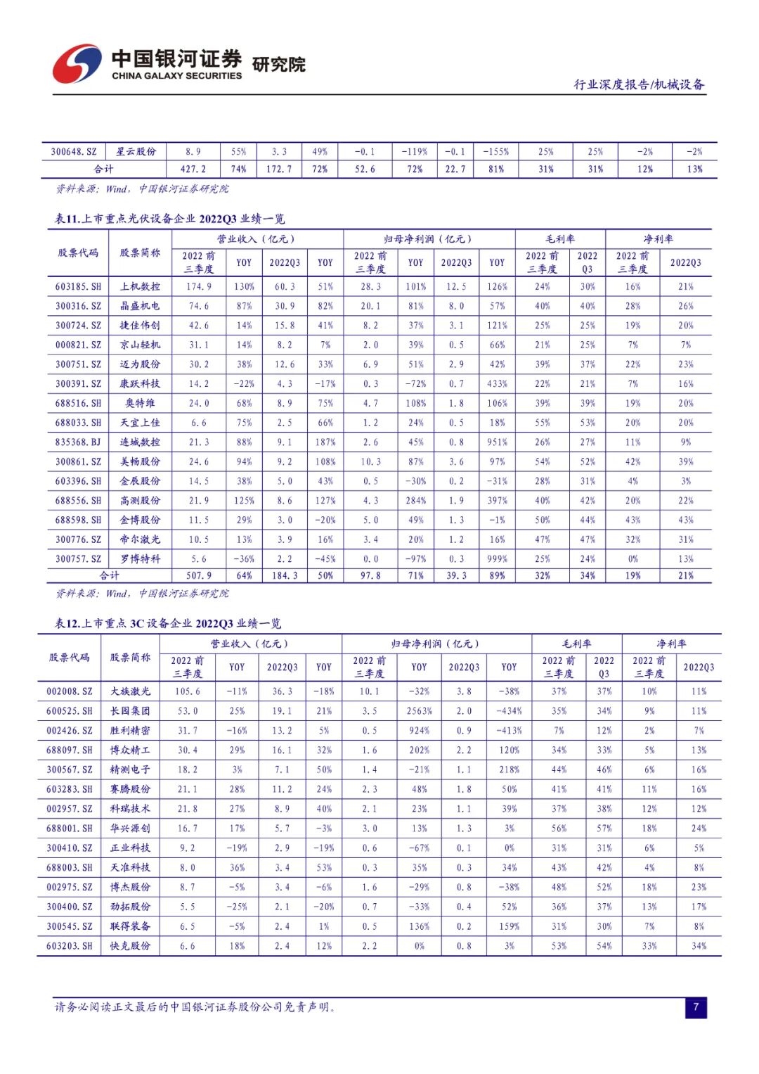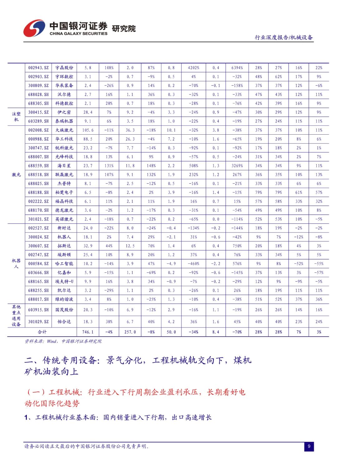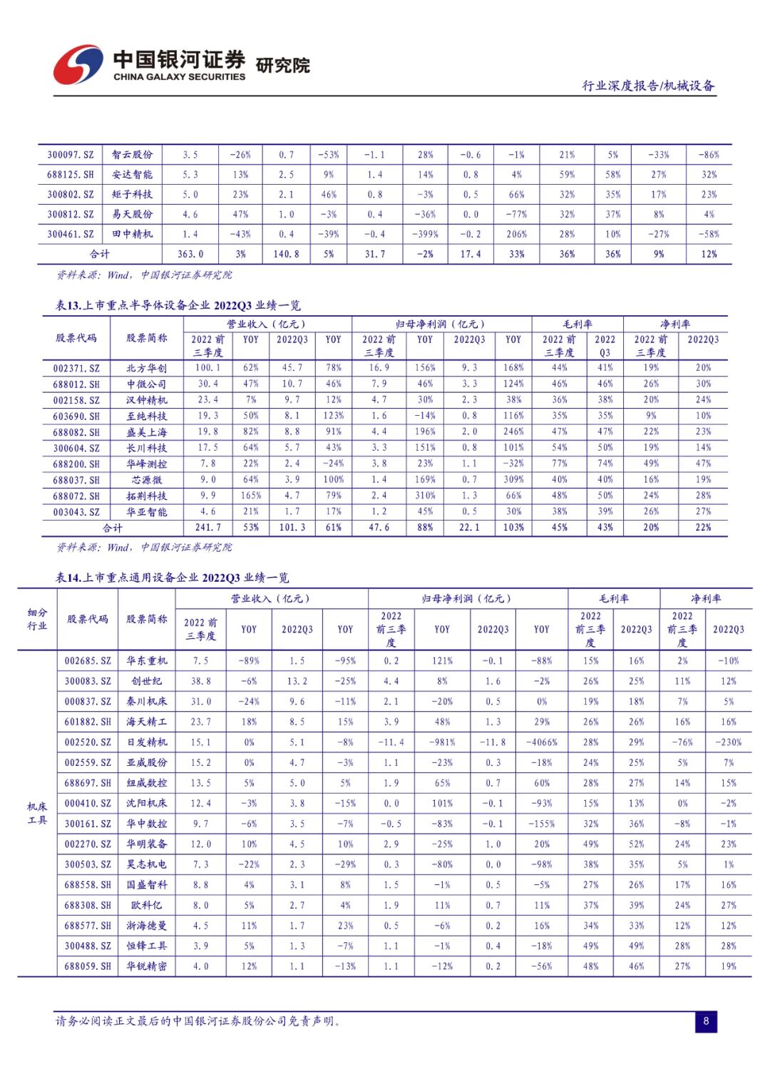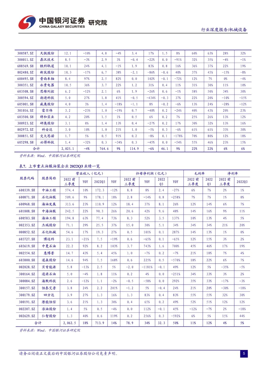 2022 年前三季度机械板块收入增速转正,净利润降幅收窄。近日,机械行业上市公司发布 2022 年三季报。我们选取了中信行业分类中机械设备上市公司共计 547 家作为分析对象。受国内外宏观经济下行压力、大宗商品价格震荡、全国疫情防控、部分行业周期性等因素影响,2022 年前三季度 547 家公司合计实现营业收入 13913 亿元,同比增长 0.55%;归母净利润 939 亿元,同比下降 14.18%。随着生产交付持续好转,原材料价格回落,2022Q3 单季度机械行业收入稳健增长,净利润降幅收窄,实现收入5076 亿元,同比 11.85%;净利润 337 亿元,同比下降 0.26%。