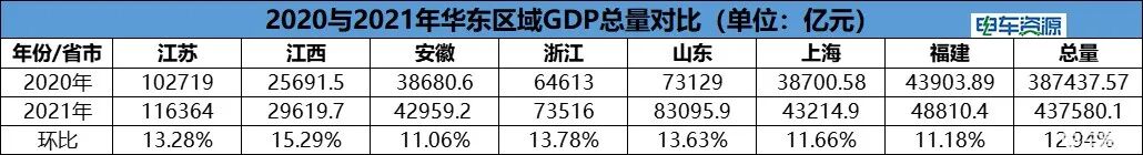 从2021年华东区域6省市的GDP来看,江苏排在第一位,为116364.0亿元,环比2020年增长13.2%;江西增速最大,为15.29%,2021年GDP总量为29619.7亿元;上海为43214.9亿元,环比增长11.6%。