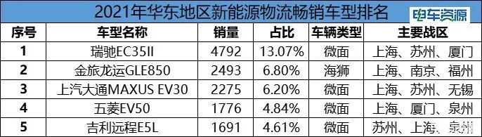 在华东区域TOP5车型中,单车销量最高的是瑞驰EC35II,单车销量占比高达13%,主要在上海、苏州、厦门畅销。