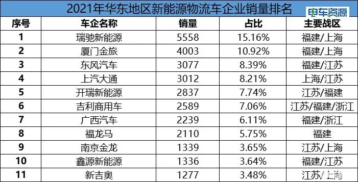 从企业方面来看,2021年华东地区共有超70家新能源物流车企业有销量。其中,瑞驰新能源销量最高,达到5558辆,占华东区域总销量15%的份额;厦门金旅排在第二位,销量是4003辆,占比是10.9%。这两家企业在华东区域最为明显的特征是大部分销量集中在福建、上海,但厦门金旅的销量比瑞驰新能源少了近1600台。