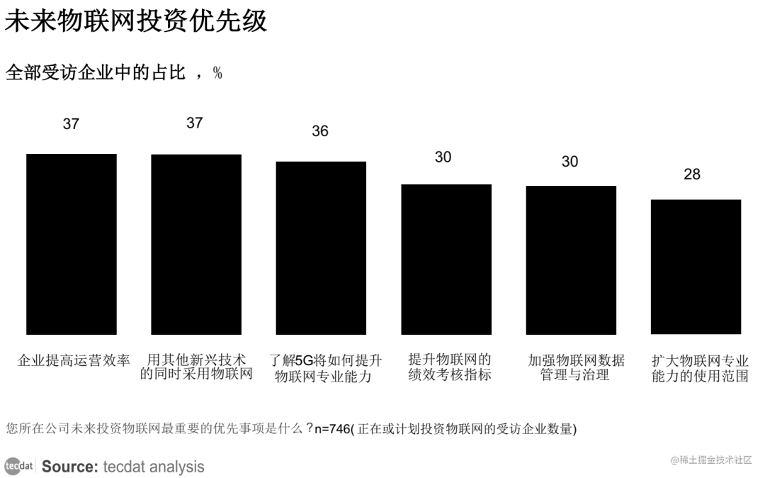 就未来的 IoT投资而言,公司更重视 IoT提升营运效能的潜力,而非促进营运收益的成长。在接受调查的公司中,有37%的公司已经对物联网进行了投资,而去年这一比例仅为30%。与此形成鲜明对比的是,在接受调查的公司中,期望通过物联网带动营收增长的公司所占比例从去年的第四降至第七。有关物联网投资的研究表明,相对于前几年,物联网对公司增加新收入和升级商业模式的重视程度有所降低。