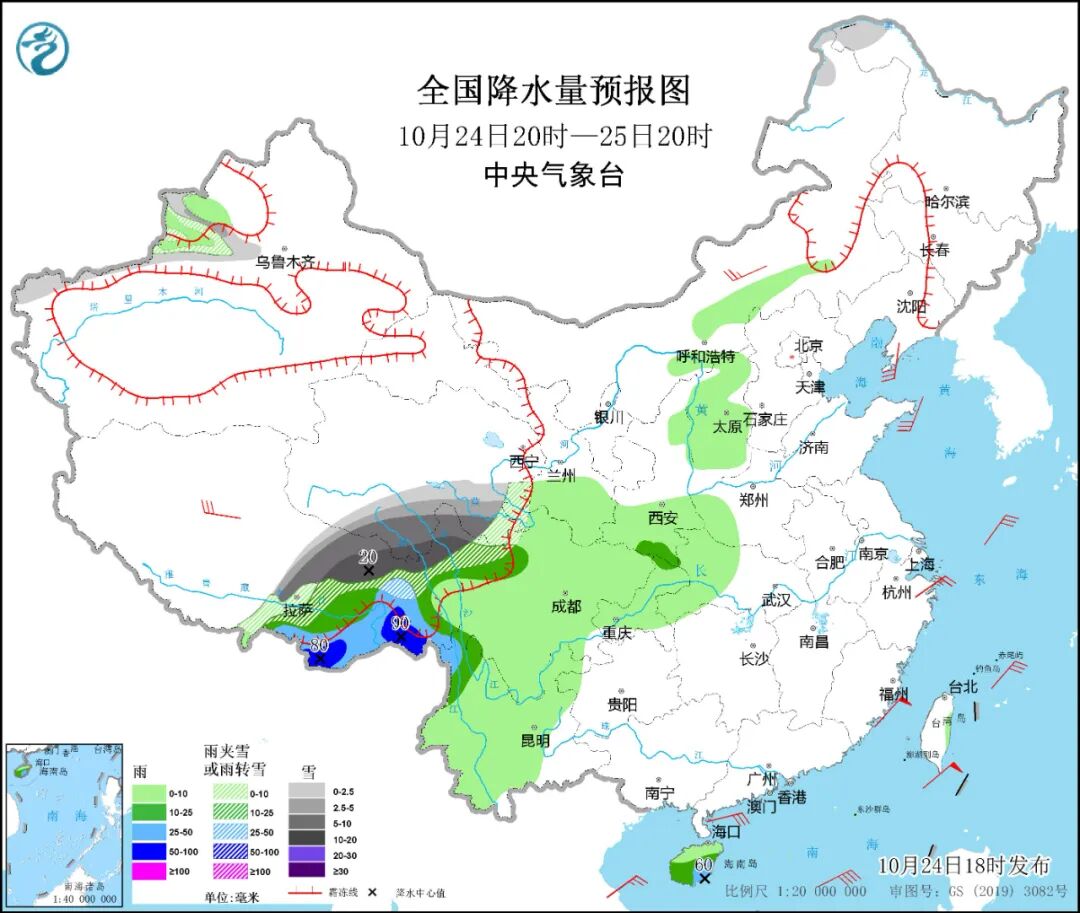 中央气象台预计,24日20时至25日20时,新疆南疆西部山区、青藏高原东部等地部分地区有小到中雪或雨夹雪,其中,西藏东北部、青海东南部、川西高原北部等地部分地区有大到暴雪,局地大暴雪。西藏东南部、川西高原北部、云南西北部、海南岛等地部分地区有中到大雨,其中,西藏东南部、海南岛东南部局地有暴雨。