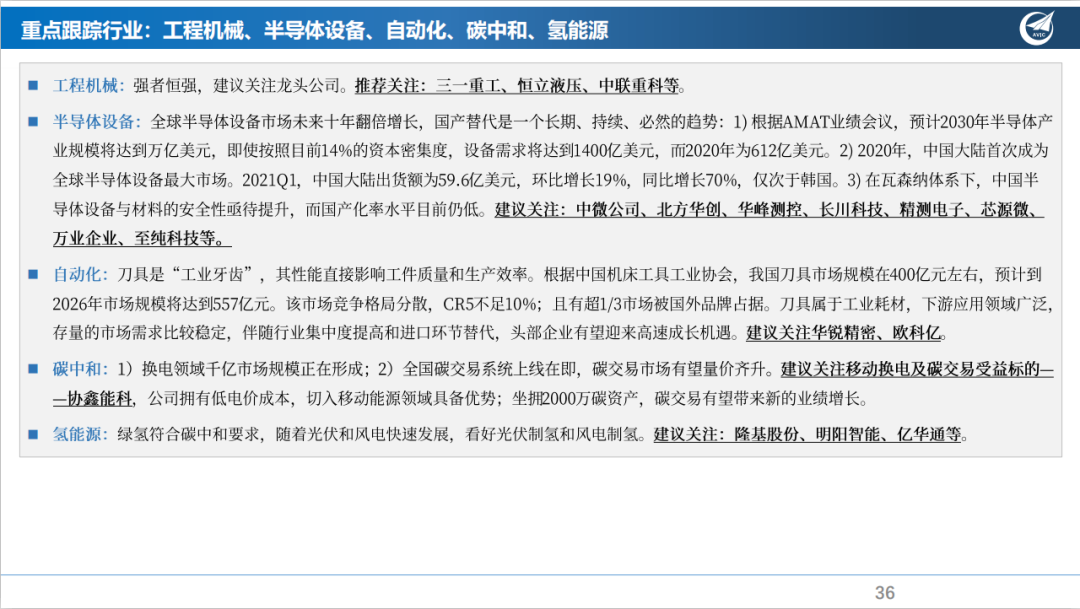 工程机械:强者恒强,建议关注行业龙头,看好具备产品、规模和成本优势的整机和零部件公司。