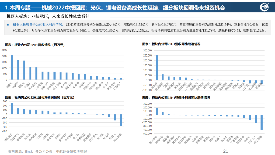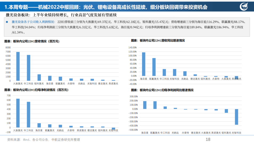 根据申万行业分级数据,我们选取了与机械设备相关的共计17个板块,345家上市公司。根据各三级行业的中报数据,通用机械与专用设备行业业绩有所分化。以工业机械设备、工控设备为主的通用机械设备行业普遍业绩承压,主要原因或为疫情冲击、国内外需求不足等原因所致。以光伏加工设备、锂电专用设备板块为主的专用设备营业收入、归母净利润普遍高速增长,带动业绩稳定向好。建议关注:1)光伏加工设备企业——金辰股份、天通股份、高测股份、晶盛机电、双良节能。2)锂电专用设备厂商:东威科技、星云股份、先导智能。3)机器人设备制造商:绿地谐波、天准科技。此外金属制品、磨具磨料、机床工具、轨交设备、仪器仪表等板块经过回调后目前处于较低的估值分位,建议低风险偏好的投资者适当关注。
