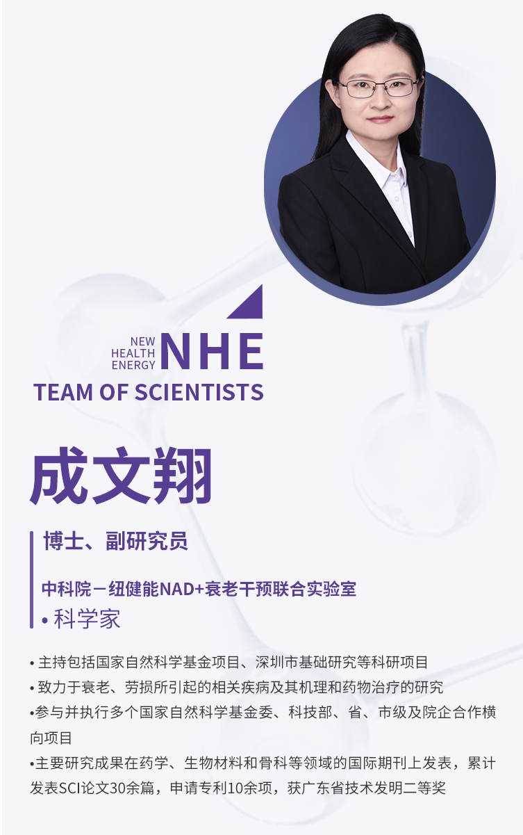 以NAD+衰老干预转化医学研究为基础,聚集了国内医药和药学领域的一批权威科学家和国家级领军人才,致力于NAD+衰老干预的科研、产品解决方案及衰老干预管理方案,法国医学科学院、法国药学科学院外籍院士苏定冯出任研究中心主任;国家863课题研究员、第二军医大学教授楚正绪担任首席科学家。