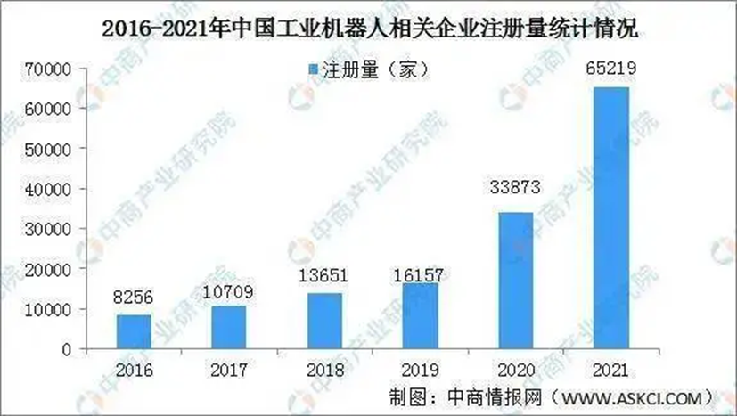 工业机器人被广泛应用于电子、物流、化工等各个工业领域之中,极大提高了生产效率、安全性以及智能化水平。近年来,国家推行机器换人,工业机器人备受追捧,工业机器人相关企业大量涌现。2016年工业机器人相关企业注册量仅8256家,2017年突破1万家,2020年突破3万家达到33873家,2021年工业机器人注册量大增,新增65219家企业。